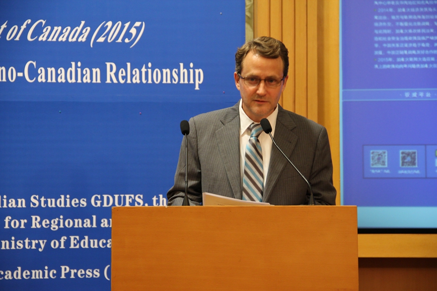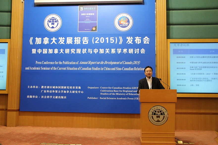 本网讯 4月28日,《加拿大发展报告(2015)》发布会暨中国加拿大研究现状与中加关系学术研讨会于北校校国际会议厅召开。加拿大驻广州总领事馆政治经济与公共事物领事Stephen Doust,中国加拿大研究会副会长杜发春,我校校长、《加拿大发展报告(2015)》主编仲伟合,副校长方凡泉、阳爱民等出席了会议,听取了有关加拿大蓝皮书的主题报告,并分别阐述了对中加研究及中加关系现状的看法。会议由加拿大研究中心主任唐小松主持。