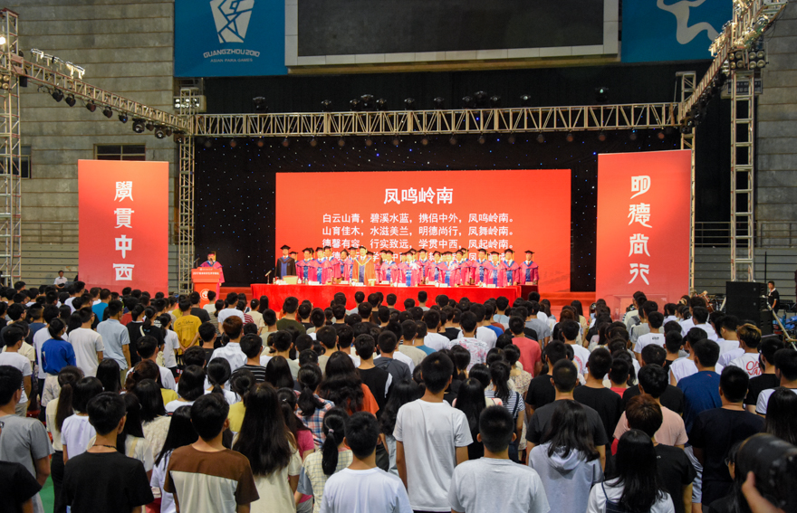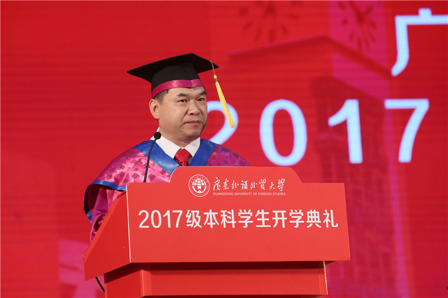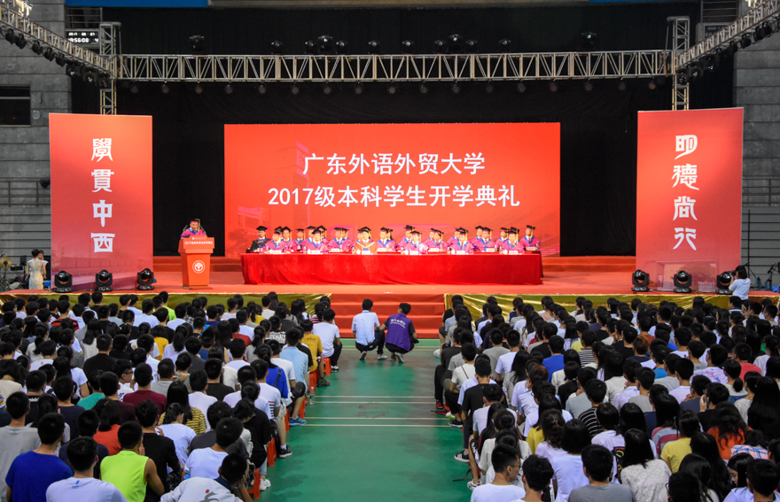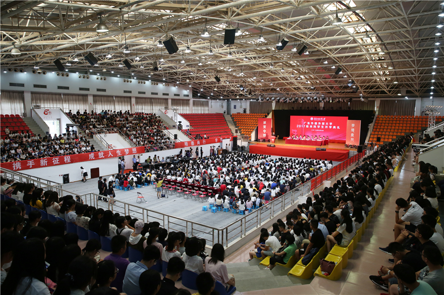 本网讯 9月7日,2017级本科生开学典礼在分别南北校区体育馆举行,校党委书记、校长隋广军发表“秉承广外价值观,砥砺青春求学路”的讲话,为5001名新生上了有意义的入学第一课。隋广军阐释了广外精神、内涵和格局,首次阐述广外“卓越 诚信 包容 自信”的价值观,引导新生成长成才,在师生中引起强烈反响。校党委副书记李云明,副校长何传添、陈林汉、阳爱民、焦方太,学校机关部处和各学院的领导以及校友代表出席开学典礼。典礼由焦方太主持。