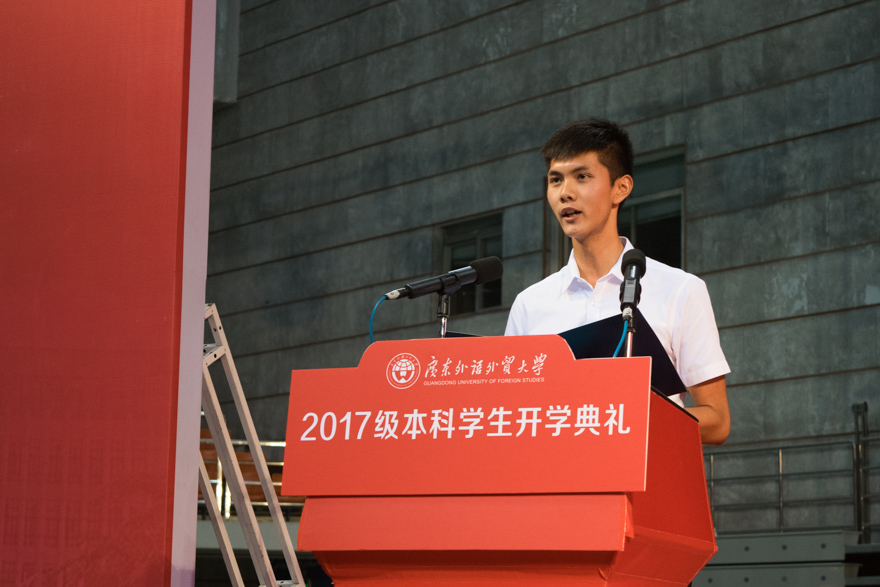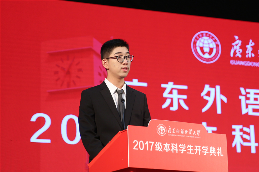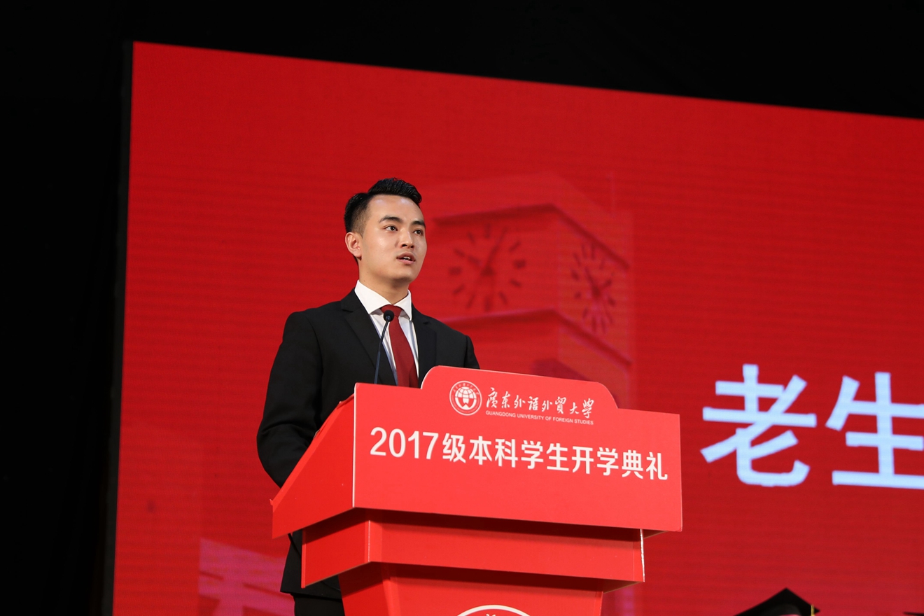 来自会计学院的杜显邦代表老生发言,希望学弟学妹们在这“充满爱的味道”的校园里,能尽情体验大学生活,在广外遇见更好的自己,不要害怕去尝试,有梦就去追;做到“有事做,有人爱,有所期待”。