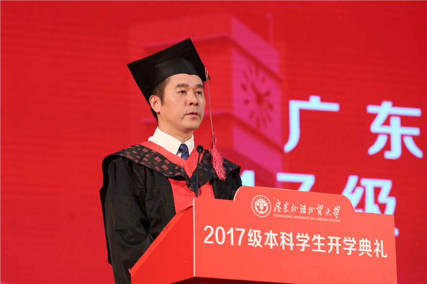 东语学院90级校友、现任中共广州市委宣传部副部长朱小燚向新生分享自己在广外度过的大学时光,结合自身工作经历,以生动的例子鼓励新生既要眼望大世界,也要胸怀小宇宙;既要树立远大理想,也应建立近期目标;既要真情做人,也要理性做事;既要说得响亮,也应做得漂亮。