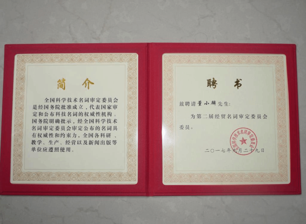 据悉,董小麟曾任国家经贸名词审定委员会首届委员。全国科学技术名词审定委员会是国务院批准设立,为规范科技名词范畴的使用,代表国家审定和公布科技名词的权威机构。经全国科学技术名词审定委员会审定公布的名词术语的定义,具有权威性和约束力,全国各科研、教学、生产、经营以及新闻出版等单位应遵照使用。