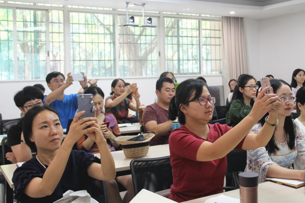 现场就是否应禁止学生在课堂中使用手机展开热烈的讨论。焦建利通过网络当场收集在座学员的疑问,在以身示范如何创建互动课堂的同时为在座学员解惑。现场气氛热烈,在场学员表示受益匪浅。