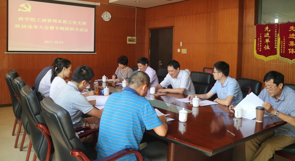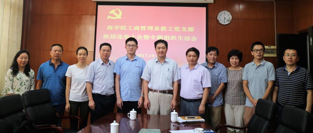 本网讯 10月12日下午,商学院工商管理系教工党支部在南校区院系楼360会议室召开换届选举大会暨专题组织生活会。我校党委书记、校长隋广军参加党支部换届大会并在专题组织生活会中作主题发言,商学院党委书记李华受邀列席会议,支部党员共9人参加了会议。会议由支部书记丁浩主持。