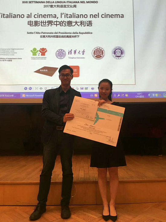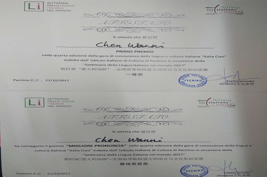 本网讯 10月21日,由意大利驻华使馆文化处主办的第四届“意大利语桥”——全国高等院校意大利语言与文化知识竞赛在北京举行。“意大利语桥”是意大利语言文化周系列活动之一,也是全国意大利语专业学子最重要的才艺展示和知识交流的平台。我校西语学院意大利语系学生陈婉霓以发音与语言流畅度单项和总分均第一的成绩脱颖而出摘得桂冠,并且获得最佳发音奖。