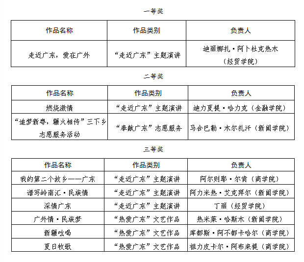附:广外新疆少数民族学生“爱在广东”主题教育活动获奖名单