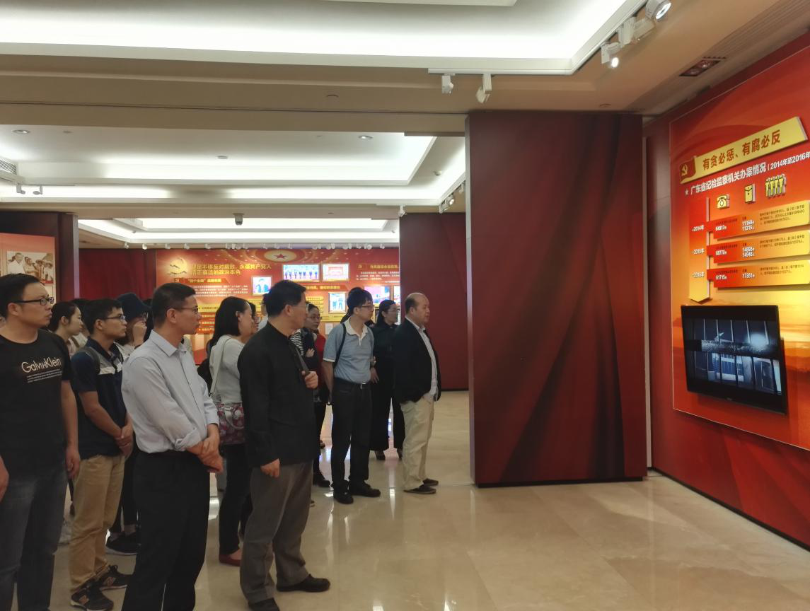 广东省反腐倡廉教育基地以“反腐倡廉、警钟长鸣”为主题,以警示教育为重点,走进教育基地大厅,庄严、肃穆的气氛扑面而来,“利剑”模样的巨大吊灯悬于上方,以示“利剑高悬”,两面浮雕墙刻画了古代岭南廉吏和当代清正模范。在基地工作人员的引导和解说下,党员们观看了基地教育片,依次参观了“风正帆扬、从严治党、贪腐鉴录、拒腐防变、风清气正”五个展览板块。各展厅以丰富的史料和典型的案例为展示基础,配合现代化多媒体手段,充分展示了我省反腐倡廉建设取得的成果,深刻剖析了近年来查处的违法违纪案件,教育党员干部要常修为政之德、常思贪欲之害、常怀律己之心。