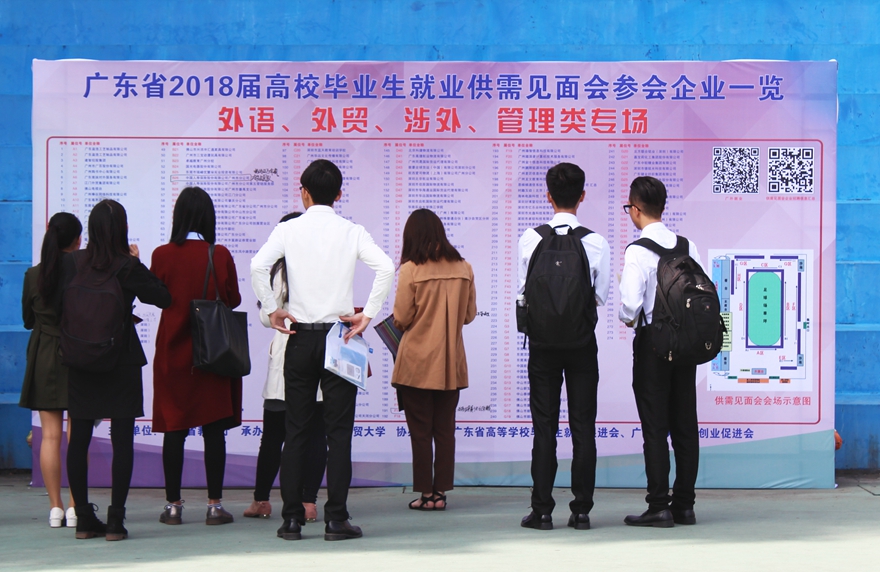 据我校就业指导中心主任谢秀兰介绍,我校2018届本科毕业生5159人,研究生毕业生1005人。2017年9月份至今,学校已安排企业专场宣讲会200多场,其中包括63家世界/中国500强企业,为毕业生提供了近4000个职位。广外学生就业指导中心重视对学生的职业辅导工作,组织实施了职业发展能力提升计划、职业发展力讲坛、“行业-专业-就业”人才需求分析大赛、广外宝洁菁英训练营、走进名企等各种形式的职业辅导活动,帮助学生认识自我、了解社会,提升求职技能,找到理想的职业。