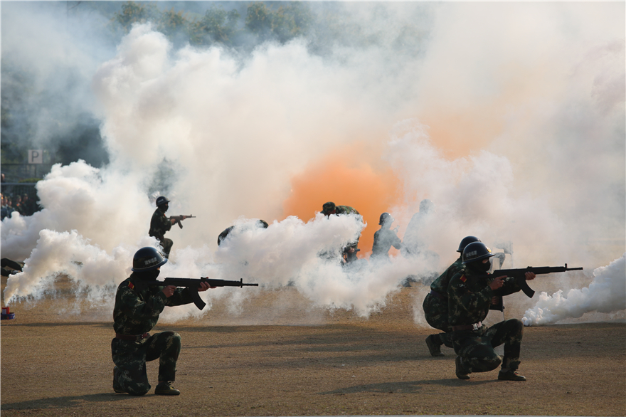 还有女子匕首操分队,她们英姿飒爽,豪情万丈,激情飞扬,彰显了“巾帼不让须眉”的气度;反恐精英的表演也赢得领导和看台观众的一致叫好,他们机动灵敏,手持步枪,在“硝烟”中前进,与“恐怖分子”斗智斗勇,最后灵活解救了“被困群众”。