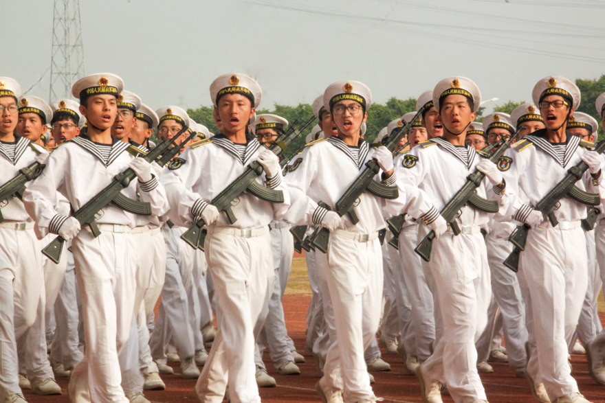 分列式表演方阵个个神采奕奕,英姿焕发,步伐铿锵有力,动作整齐划一,响亮的口号势破云霄。清一色白色制服的海军持枪方阵、蓝天一色的空军方阵、红裙白鞋的女子民兵方队、消防员方阵和迷彩服方阵也迈着整齐的步伐依次接受检阅。他们以最饱满的状态展示广外学子的别样风采,凸显广外的昂扬进取精神。