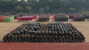 随着一声令下,擒敌拳方阵的队员从汇演运动场两侧迅速跑出,到位站定。他们出招迅速,力度精准,格挡快,下拳狠,充分展示我校健儿蓬勃英姿。同样备受瞩目的“军魂队”也表现出色。经历军训洗礼的她们坚强无畏,队员们按照不同的方位坐标的配合蹲起,手抓帽檐,利用白色手套和军服颜色的反差对比,摆出数字倒计时、广外校徽、爱心和建军等字形图案,给观众们带来了一场视觉盛宴。