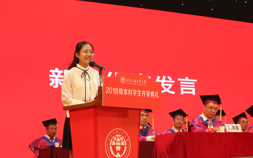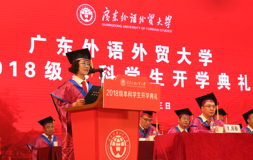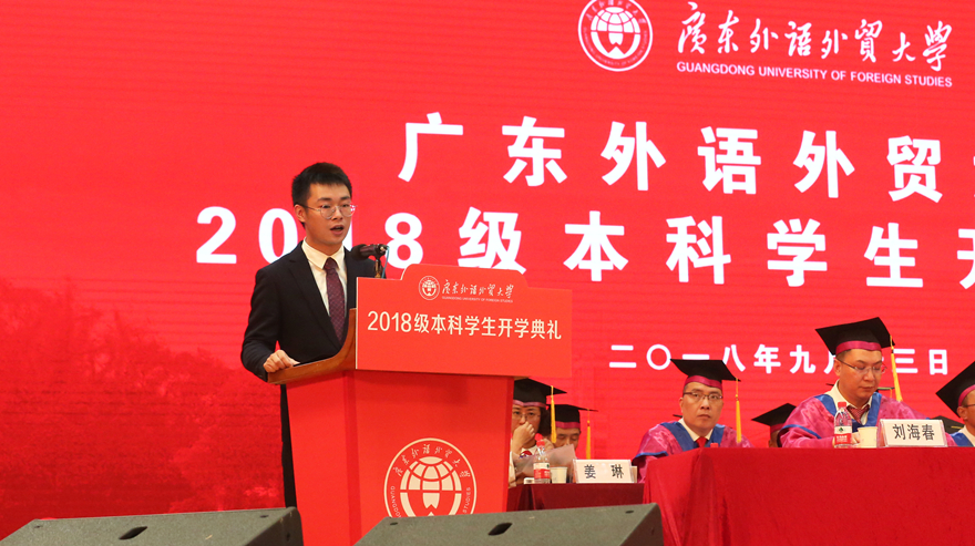 现任校学生会主席、来自经济贸易学院的伍云龙向新生们分享了三句话,与大家共勉:一是与祖国同心,与母校同行,一起做爱国荣校的广外人;二是立鸿鹄之志,担时代之责,一起做奋斗不息的广外人;三是学习出真知,实践悟真谛,一起做淬炼成钢的广外人。北校区新生代表、来自西方语言文化学院18级希腊语的李梓仪向同学们分享自己的外交梦想与奋斗目标,并自豪地站在这梦开始的地方,代表新生说:“广外,我们来了!”南校区新生代表、商学院18级卯枭说,选择广外、走进广外,是一种缘分。要成长得足够优秀,新生们需要选择正确的方向,所做的努力才有价值。他也期待能在广外的舞台上,同新生们一起,成为更好的自己。四年后,能在这个纷繁的社会舞台上,一起“C位出道”。