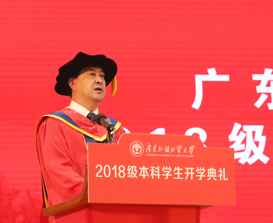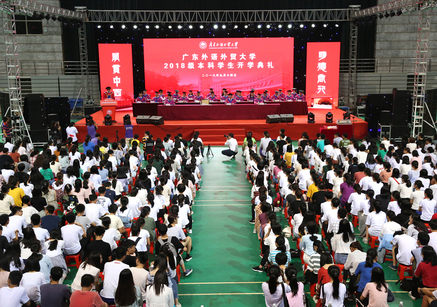 本网讯 9月13日至14日,2018级本科生开学典礼在南北校区体育馆举行。校党委书记隋广军在开学典礼上致辞,为本科新生上了“大学第一堂思政课”,寄语2018级新生涵养家国情怀,立德立功立言,秉持“卓越、诚信、包容、自信”的广外价值观,立志成长为“有德有才、有情有义”的广外人。校党委副书记李云明,副校长何传添、刘海春、陈林汉、阳爱民、焦方太等校领导,学校机关部处和各学院的领导出席典礼。典礼由刘海春主持。