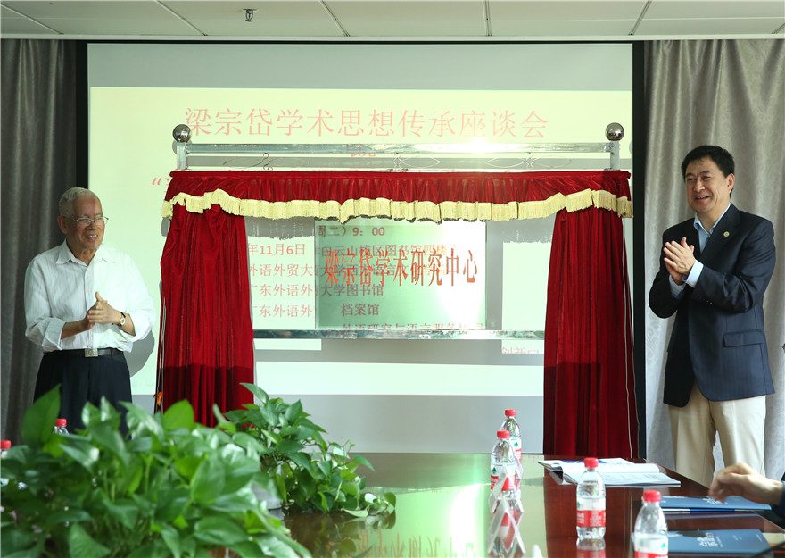 本网讯 11月6日上午,梁宗岱先生逝世35周年之际,我校在北校区图书馆会议室召开梁宗岱学术思想传承座谈会暨梁宗岱学术研究中心成立大会。我校党委书记隋广军、我校原校长黄建华为梁宗岱学术研究中心揭牌。北京外国语大学原党委书记杨学义,天津外国语大学原校长修刚,中国社会科学院外文所所长陈众议,中国法国文学研究会原会长吴岳添,浙江大学世界文学与比较文学研究所所长吴笛,《法国研究》杂志主编罗国祥,中国法语教学研究会副会长刘成富,以及广外原党委书记校长徐真华,广外外国文学文化研究中心原主任栾栋,广外云山讲座教授黄荭等校内专家学者参加了座谈会。