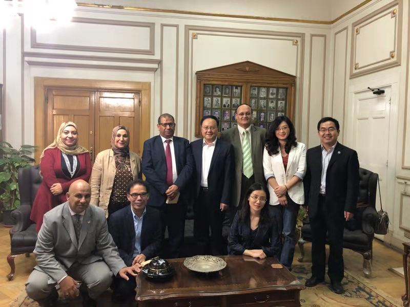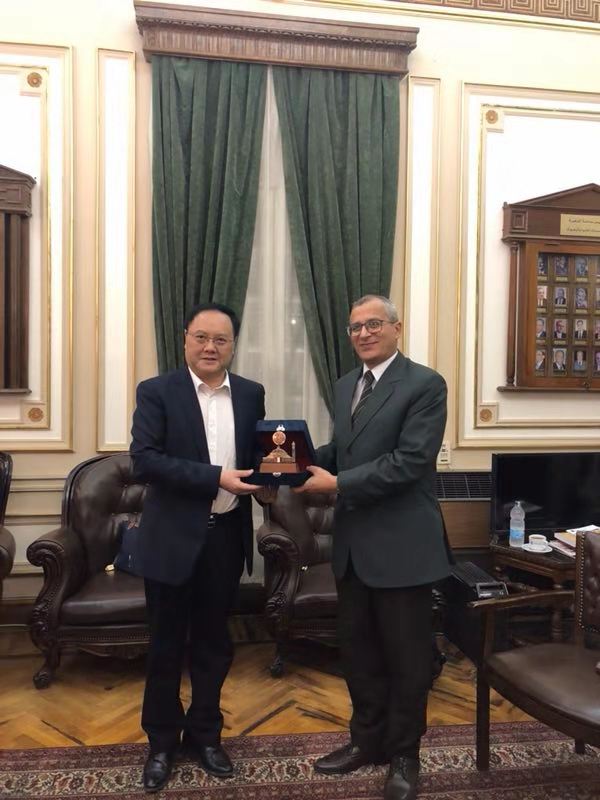 在开罗大学,石佑启与Aiman S. EI-Khatib副校长会谈,双方表示将共同推动两校合作关系的建立。我校与开罗大学的合作协议已经进入埃及教育部的审核程序,一旦完成签字程序,我校将是开罗大学的第一个中国合作伙伴。石佑启还访问了开罗大学文学院,与Ahmed EL-Sherbini el-sayed院长、Raga Ahmed Aly和Gamal el-Shazly副院长、阿拉伯语系系主任Khairy Douma、阿拉伯语言文化中心主任Fehr Mahmoud Shaker座谈,双方表示将尽快启动学生联合培养项目和教师互访。
