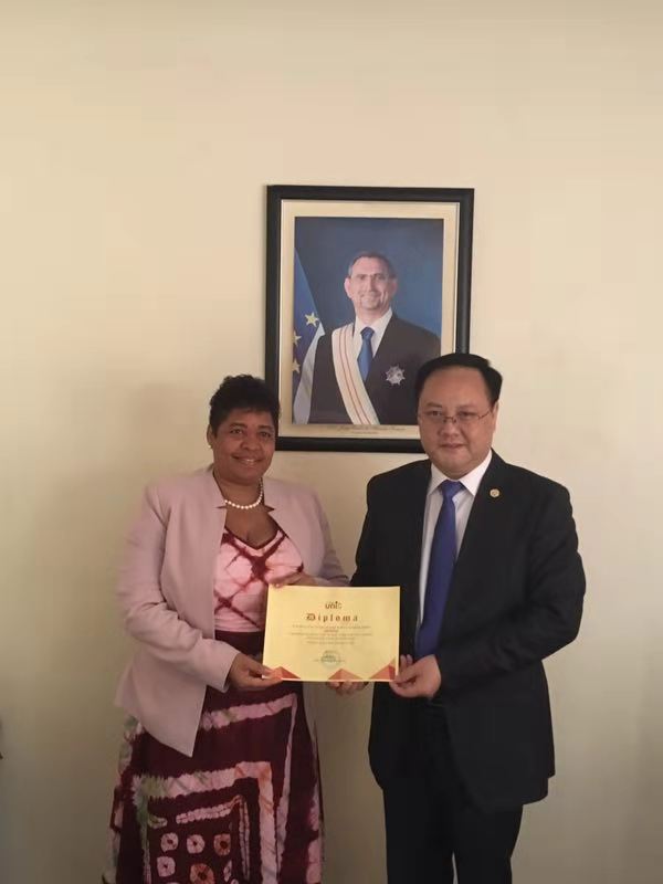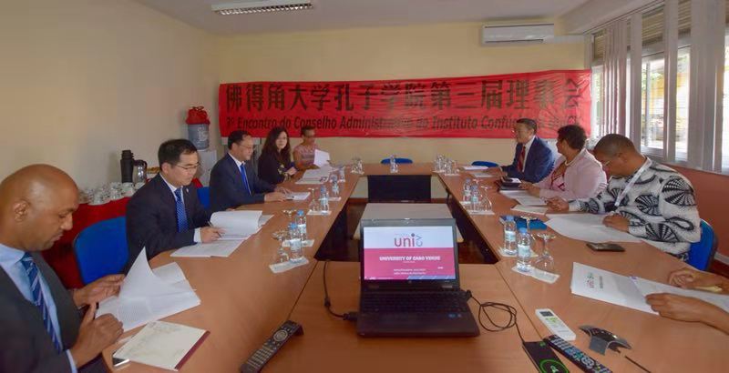 在佛得角大学,石佑启与Judite Medina do Nascimento校长亲切会晤,双方回顾了自佛得角大学孔子学院建立以来两校的良好合作和频繁交流。双方表示,将以孔子学院为纽带,进一步加强两校交流与合作、拓展新的合作领域。访问期间,代表团出席了佛得角大学孔子学院理事会会议,石佑启慰问了在佛得角大学孔子学院工作的汉语教师和学生志愿者,参观了佛得角大学新校区及新校区中拟设的孔子学院办公室,并与项目承建商中国龙信集团座谈。