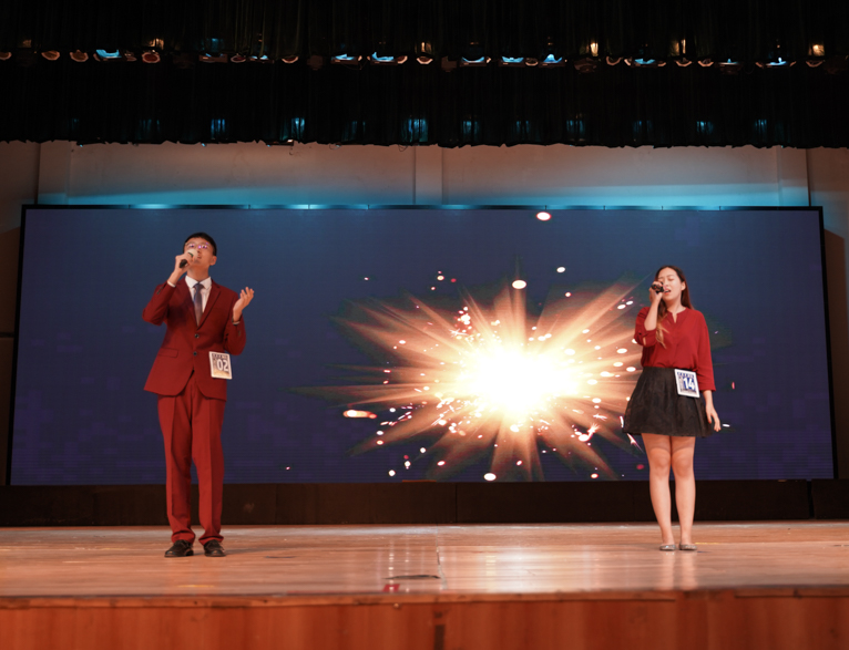 来自日语亚非语言文化学院的谢子来与来自高级翻译学院的宋苑馨玉合作演唱的《追梦赤子心》唤起了大家一片拳拳赤子情,男生的磁性中音与女声的高亢声线,完美描摹出了歌声中那份勇于迎着冷眼嘲笑、奔往明天的决心与勇气。