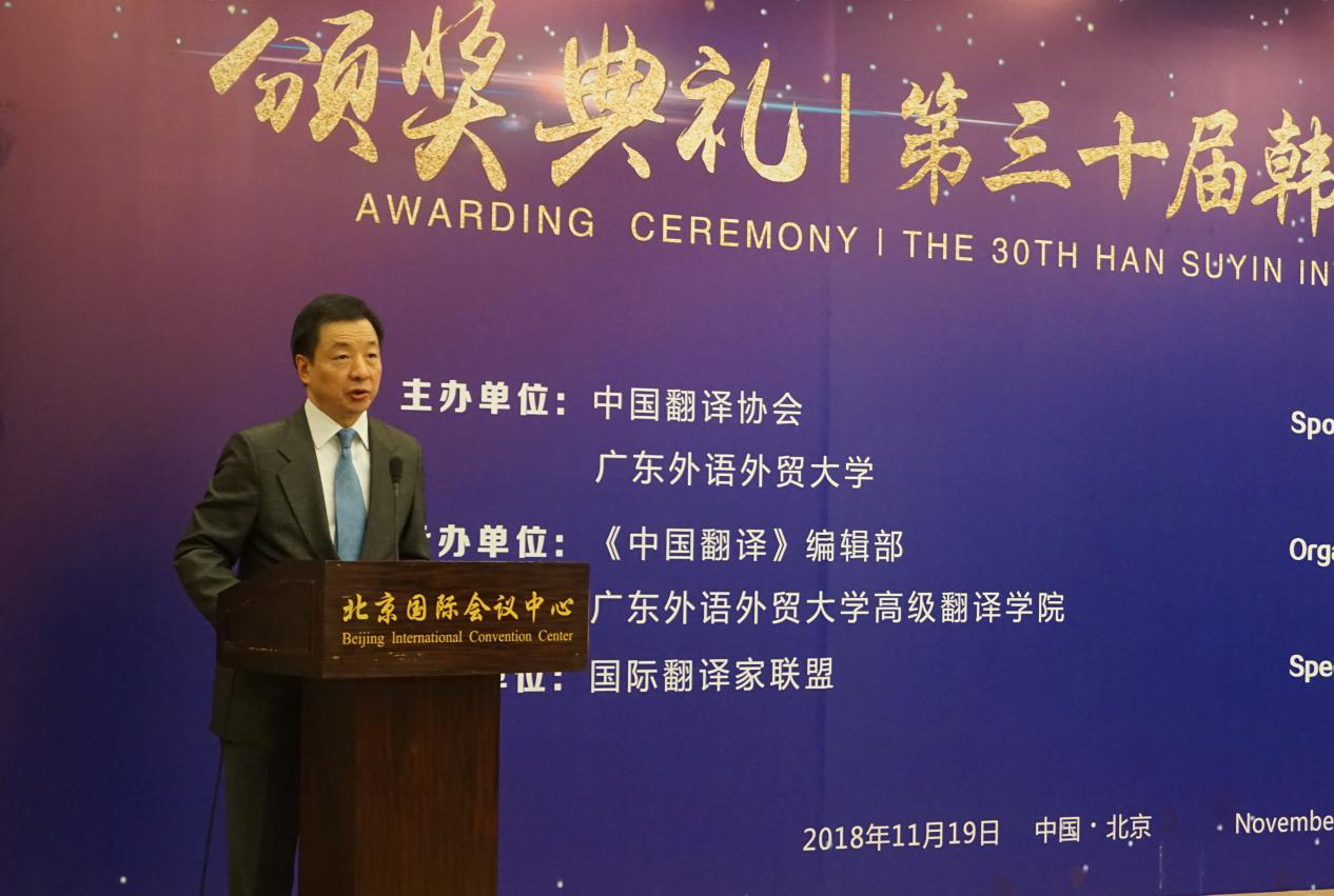 本网讯 11月19日下午,“第三十届韩素音国际翻译大赛”颁奖典礼在北京国际会议中心举行。我校王丹等22人斩获大赛奖项,获奖人数居全国各高校榜首,我校方开瑞等在“我与韩奖”征文比赛中获奖,我校也获颁“组织承办奖”。中国翻译协会会长周明伟,我校副校长刘建达,国际翻译家联盟(FIT)主席Kevin Quirk等出席颁奖大会并致辞。