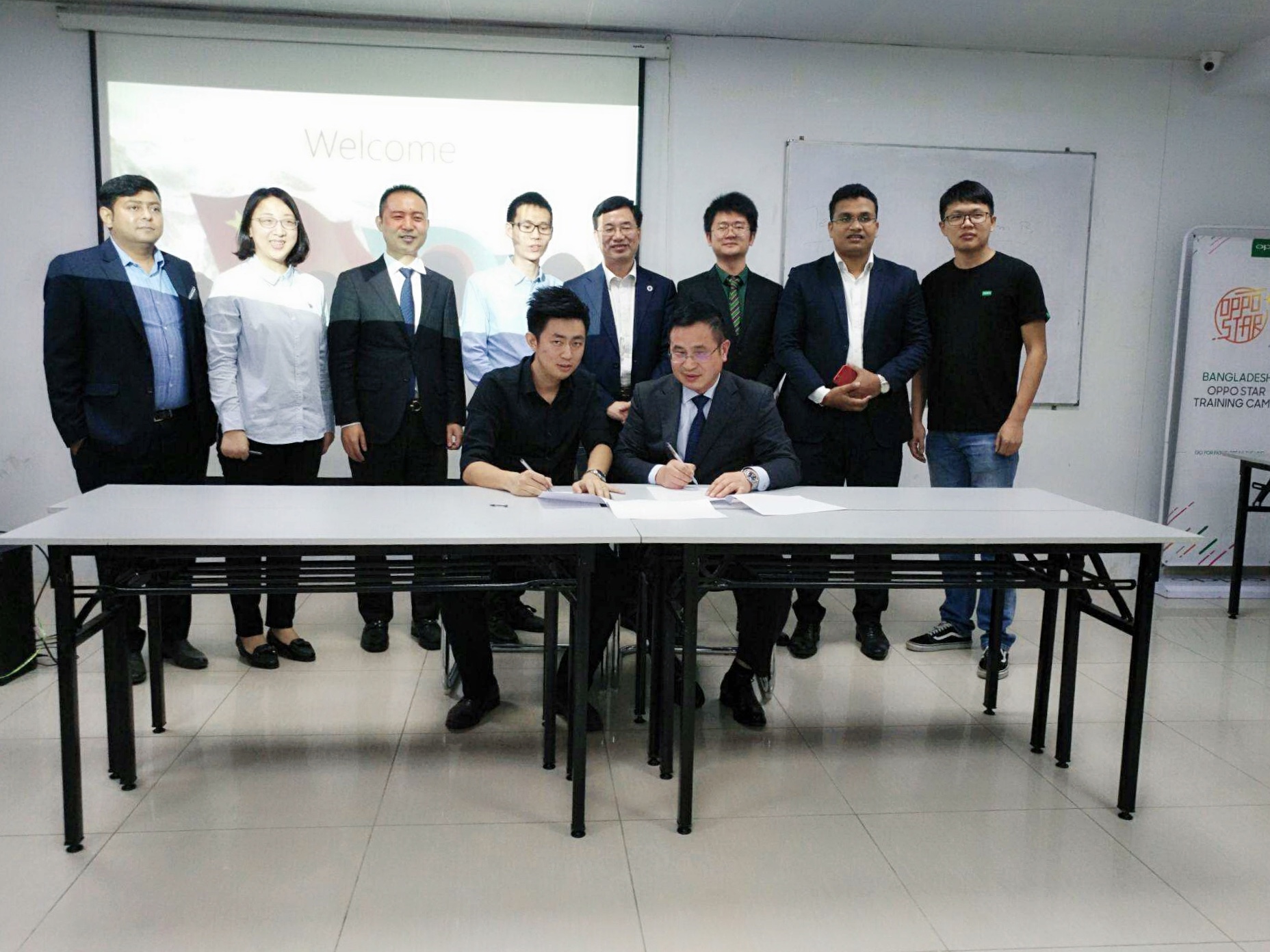 11月21日下午,何传添一行访问OPPO孟加拉通讯有限公司,了解中资企业在孟加拉的发展情况以及对人才的需求情况,日语学院和亚非学院院长陈多友和OPPO孟加拉负责人杨桢共同签署了学生实习基地协议。