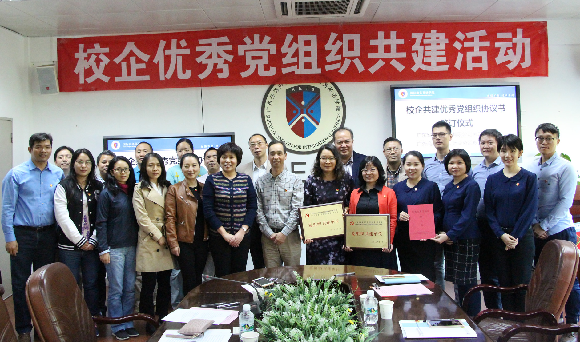 本网讯 11月22日下午,我校国际商务英语学院国际商务系教工党支部与广东省外贸开发有限公司第二党支部举行共建优秀党组织签约仪式。广新集团党群工作部部长谢坤明,省外贸开发有限公司党委书记、董事长魏高平,党委副书记王玉红,我校党委组织部正处级组织员李华,商英学院党委书记王秀民,院长郭桂杭,党委委员、院教工党支部书记及双方党支部党员参加活动。