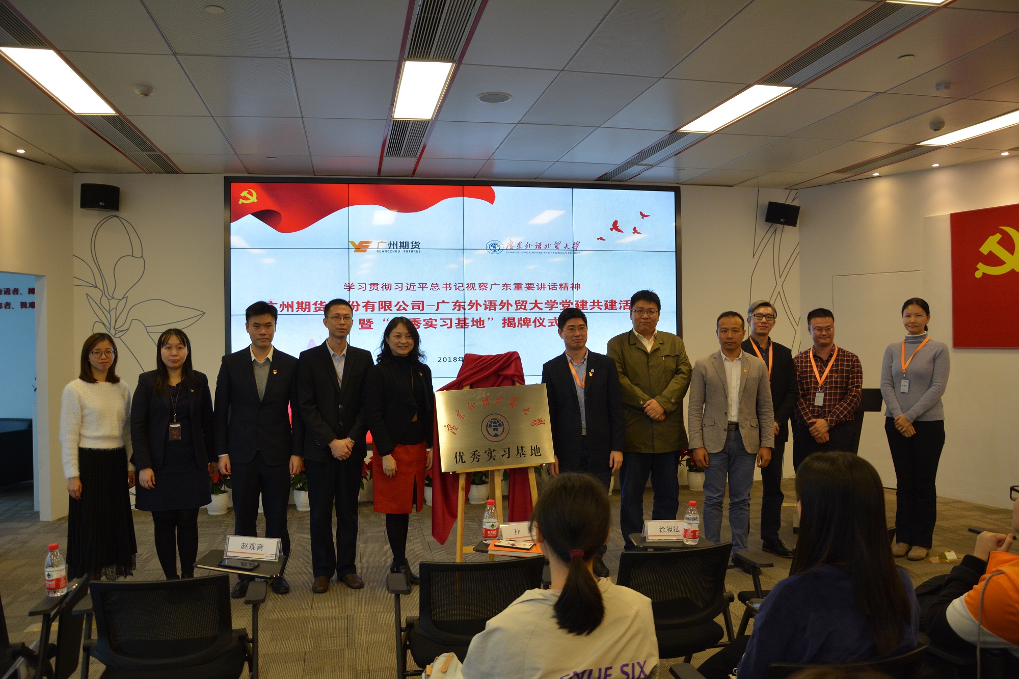 本网讯 12月7日下午,我校金融学院师生60余人来到位于广州国际金融中心的广州期货股份有限公司(以下简称“广期”),开展校企党建共建活动暨金融学院实践月“真知灼践”企业参访活动,将思政教育融入到了活动之中,并举行校级“优秀实习基地”揭牌仪式。