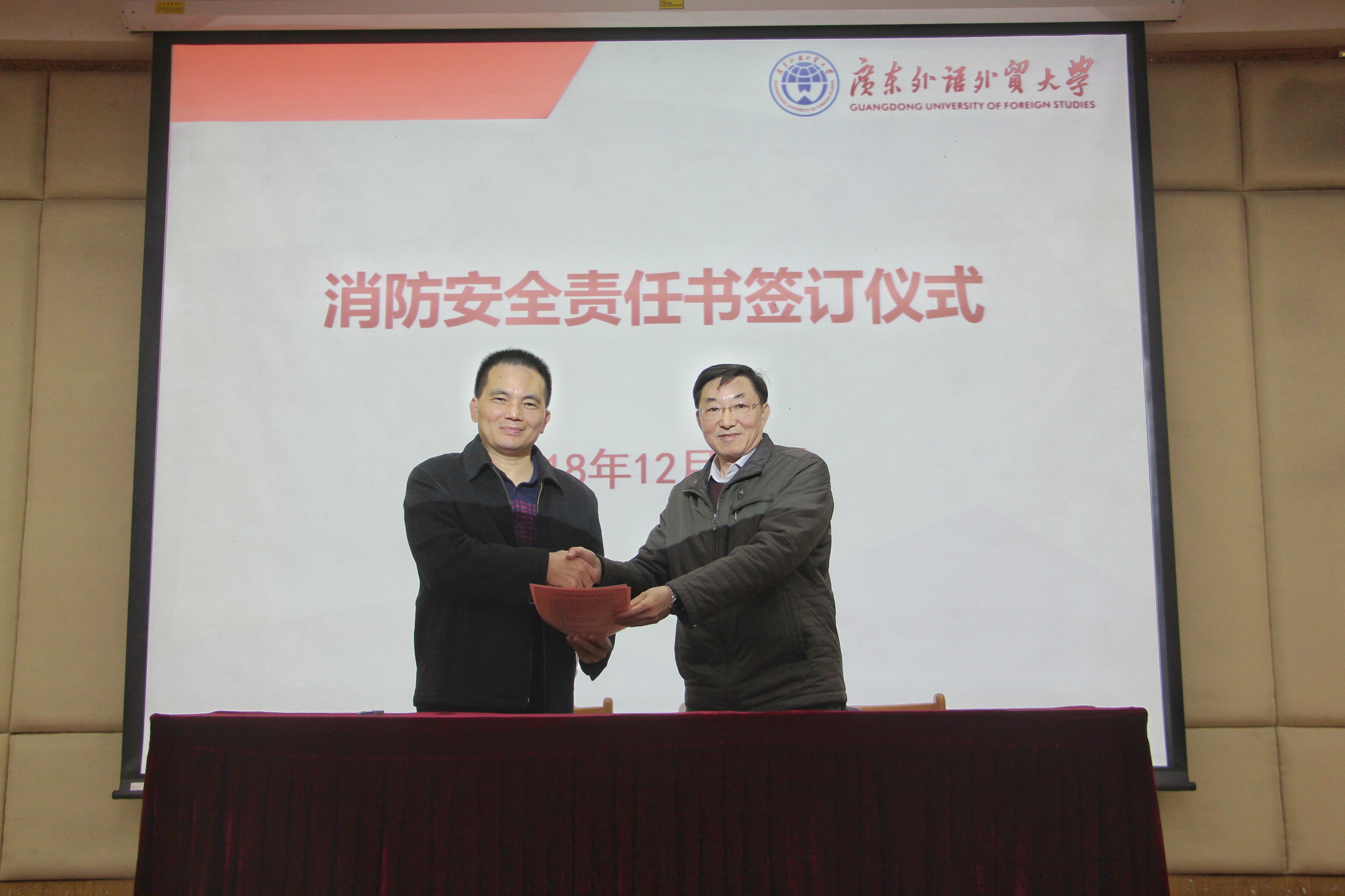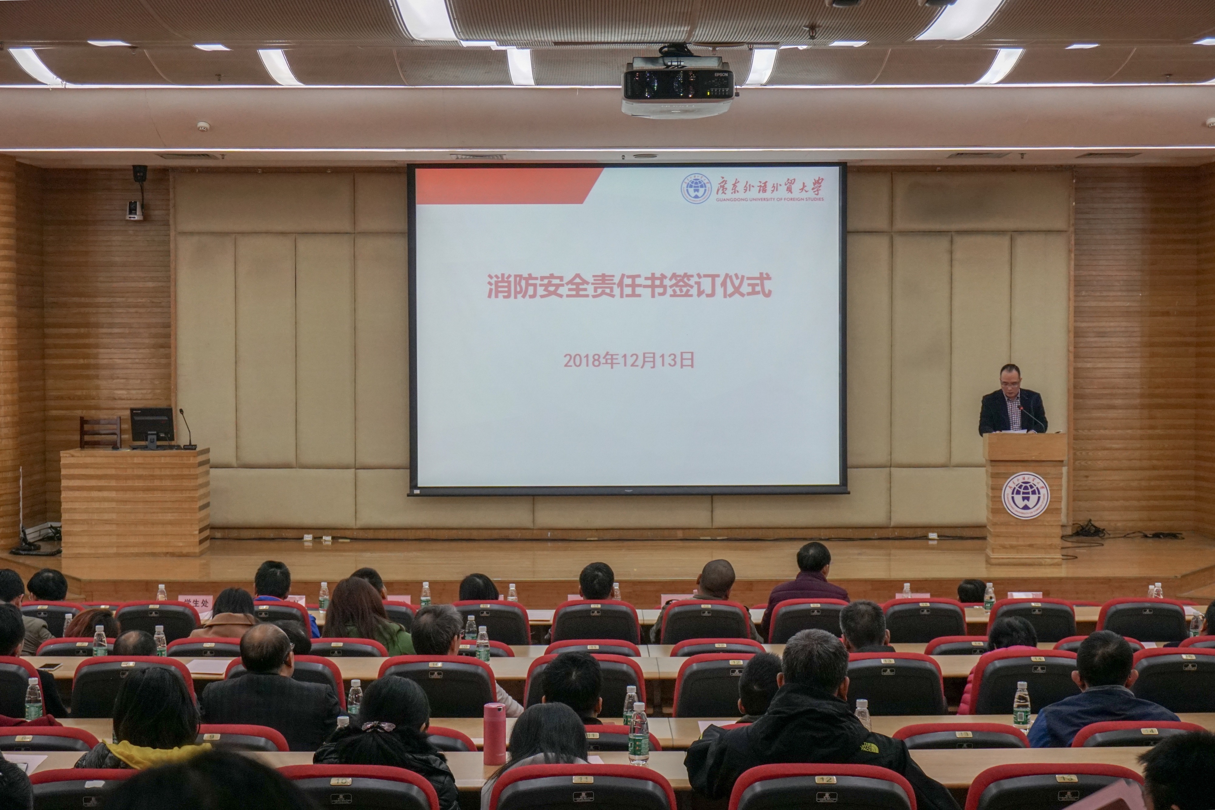 本网讯 为贯彻落实消防安全管理的相关法律法规和《2018年广东省教育系统今冬明春火灾防控工作方案》,推进我校的消防安全工作建设,进一步提升我校消防工作管理水平,确保学校安全稳定和维护广大师生生命财产安全,12月13日下午,我校在北校区图书馆报告厅举行消防安全工作会议暨消防安全责任书签订仪式。校党委副书记、校消防安全管理人李云明,各机关、教学、科研、教辅、直属、附属单位消防安全责任人参加会议。