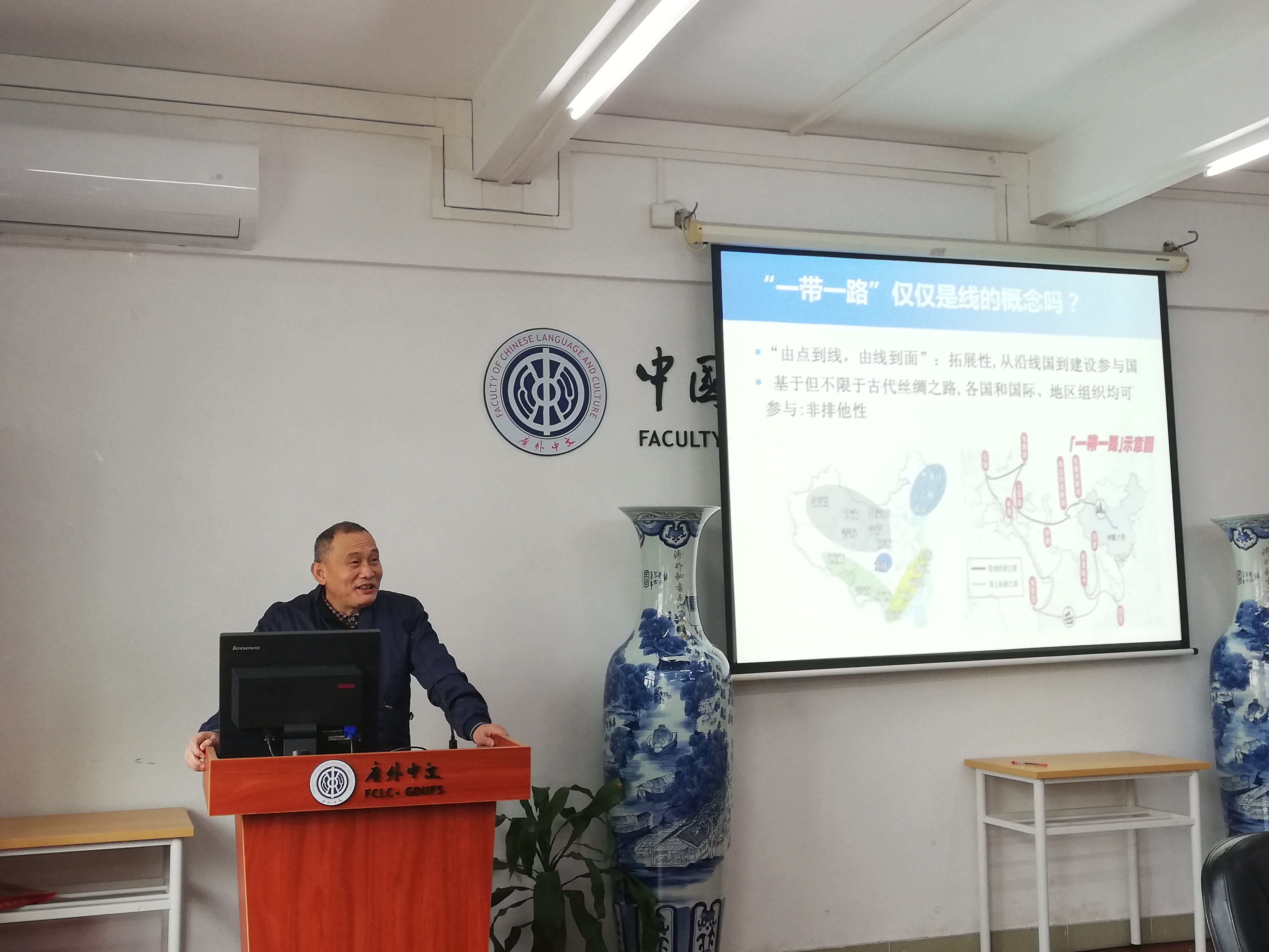本网讯 12月13日下午,我校中文学院师生党员在北校区第三教学楼422室开展专题政治理论课集体学习活动。中文学院邀请了我校思想政治教育宣讲团专家、广东国际战略研究院高级研究员,《国际经贸探索》执行主编陈伟光为师生党员授课,主题为:共建“一带一路”:理论、行动与展望。