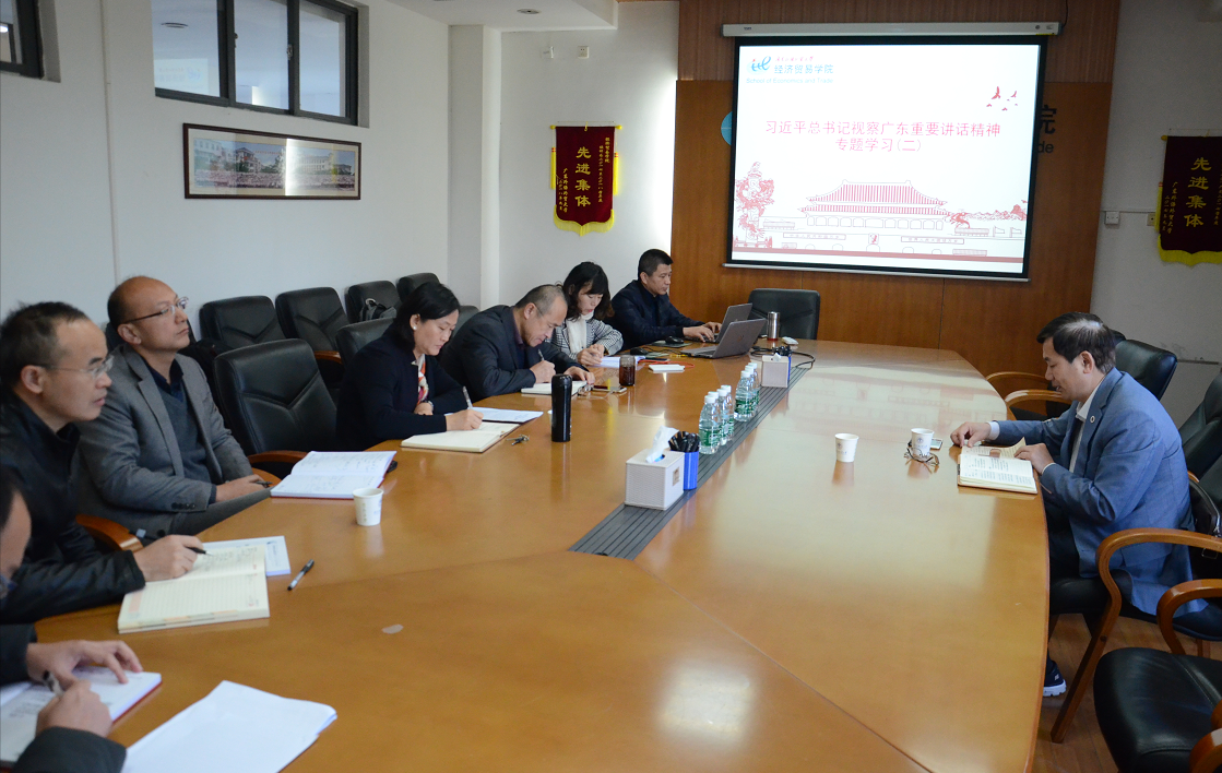 何传添结合自身学习领会,解读了习近平总书记在改革开放四十周年来临之际到广东的国内外背景、以及向全世界宣示中国改革不停顿、开放不止步的坚定决心。同时,他还强调了习近平总书记对广东提出的深化改革开放、推动高质量发展、提高发展平衡性和协调性、加强党的领导和党的建设的“四个要求”的重要性。何传添结合学校的情况,阐述了在深化改革开放中学校能做什么、应该提供怎样的人才支撑等问题和思考。他还提到在粤港澳大湾区国家战略布局中,学院应该培养怎样的高层次人才、应该为大湾区的建设建言献策,以及国际贸易专业应培养参与国际治理的国际化国际贸易人才等。
