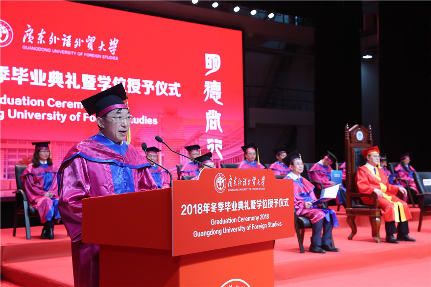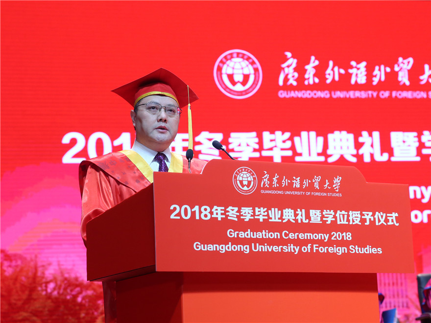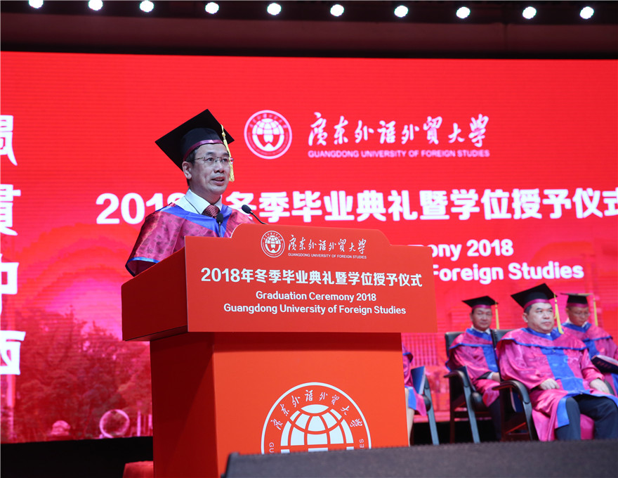 石佑启在致辞中对毕业生及其家人致以最热烈的祝贺和最诚挚的祝福。他寄语毕业生在未来的人生道路上,也能如同在大海中航行的巨轮一般,以厚德修身打牢精神的船体,以开拓创新扬起实践的风帆,以奉献家国把稳人生的航线,朝着人生新旅程新梦想奋勇向前、扬帆起航。一是要在厚德修身的涵养中宁静致远。他讲述了桂诗春先生的事迹,希望毕业生们把“明德尚行、学贯中西”的校训精神和“卓越、诚信、包容、自信”的广外价值观融进自己的血液,在纷繁复杂的社会中始终保持一颗赤诚的初心,修身慎行,宁静致远。二是要在开拓创新的坚持中务实笃行。如今走过四十年伟大历程的中国,将推进新一轮更深层次改革和更高水平开放。石佑启讲述了一个将曾经名不见经传的小厂做大做强,打造成为国内覆铜板行业的龙头企业的我校1970级日语专业校友刘述峰的故事,希望毕业生勇于开拓、推陈出新,将务实、创新的改革开放精神内化于心、外化于行。三是要在奉献家国的担当中找寻方向。他以荣获“全国模范检察官”称号的张宇筠校友为例,希望毕业生在奋勇向前的人生路途上,能够不断充实自己的专业知识和才干,以个人理想助力国家梦想,用家国情怀托举时代使命,在奉献家国的事业中升华奋斗意义、诠释人生价值。