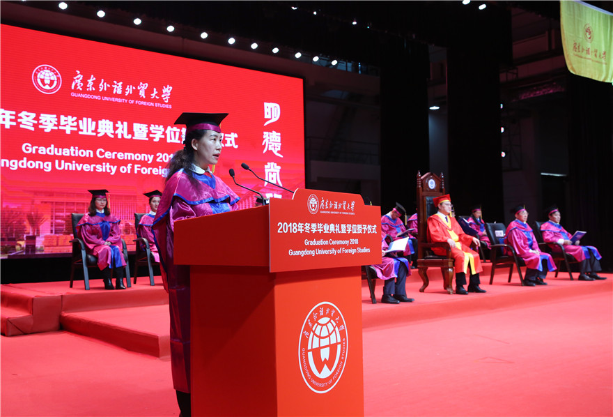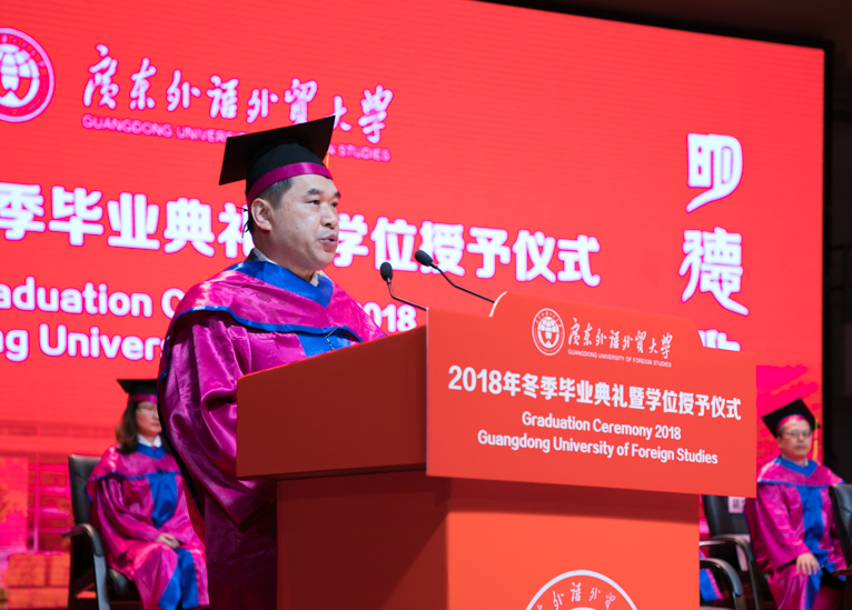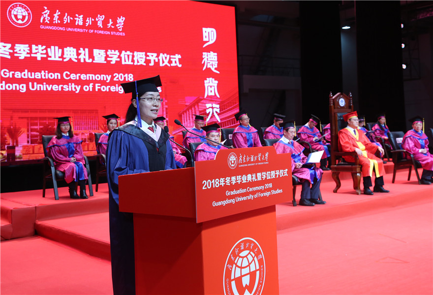 毕业生代表、商学院MBA教育中心2016级的硕士毕业生沈李君在致辞中说,非常庆幸能够在广外完成自己的研究生学业,不舍朝夕相处的同窗、恩重如山老师,以及校园里的美景美食。毕业并不意味着结束,更代表着一个新征程的开始,希望大家能够做到心系国家、心系母校、弘扬广外精神,做一个有担当、有作为、对社会有用的广外人。