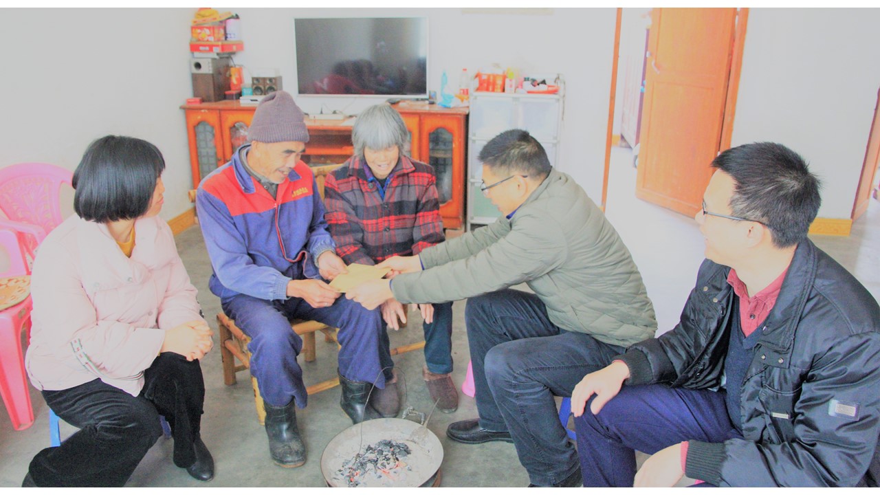 随后,国际学院一行来到学院党总支部重点帮扶农户家中走访慰问,详细询问了他们在这一年里的生产生活情况,了解精准扶贫工作成效,鼓励他们积极面对生活、奋发向上,并为每户贫困户送上慰问金和新春祝福。