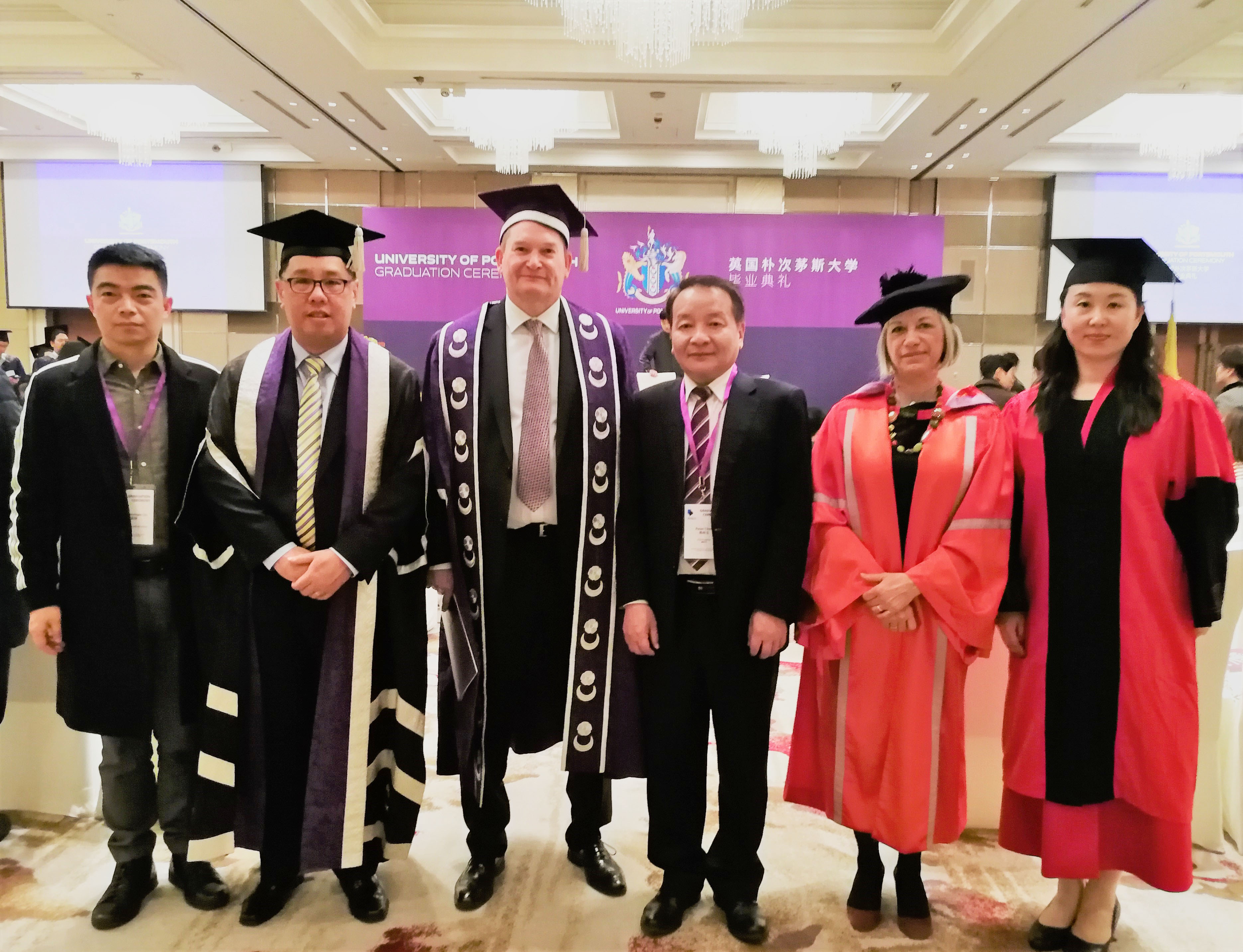 Graham Galbaith致辞,祝贺毕业生学业圆满、再展宏图,并为参加典礼的近四十位本科、硕士及博士毕业生颁授学位。典礼由朴次茅斯大学中国办公室主任王颖主持。此外,受邀观礼的还包括来自英国文化教育协会、上海交通大学、国际教育联盟等单位和机构的嘉宾。