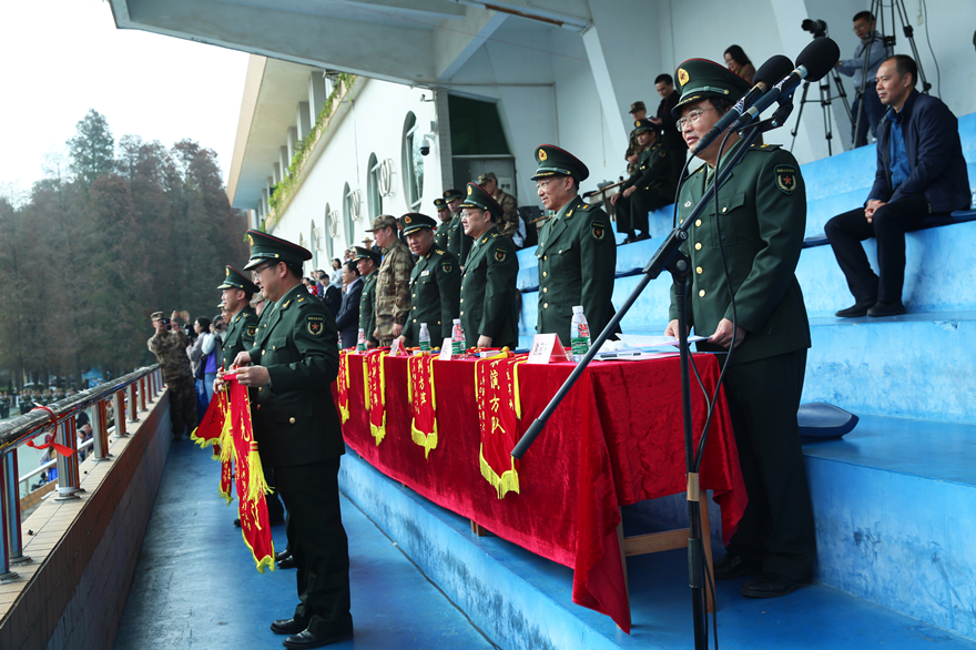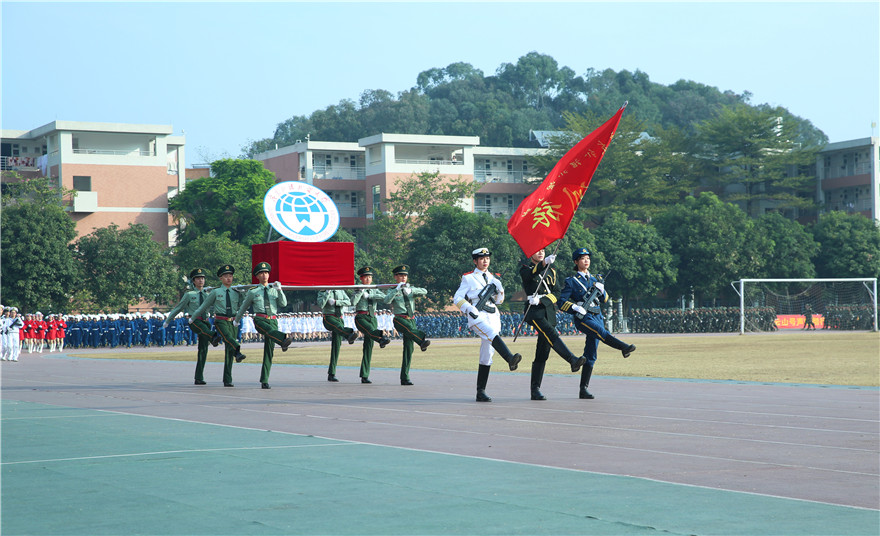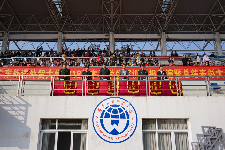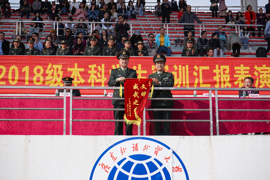 为感谢承训单位的大力配合,隋广军代表学校向番禺区国防教育训练基地赠送锦旗。校党委副书记李云明在总结中对本次军训工作表示肯定与赞赏,他提到:“我们所有人都能感受到同学们身上洋溢着的青春与活力,也看到了在精彩的汇演背后所凝聚着的辛劳与汗水,这是一次信念与意志的磨练,这是一次体力与毅力的洗礼,同学们都是好样的!”我校党委常委、副校长刘海春提到,这是我校历史第二次冬训,在总结去年首次冬训的基础上,做好了全面准备,提前部署了应急预案,确保军训任务的顺利完成。他鼓励同学们珍惜在军训中得到的财富,并将之运用到今后的学习和生活中,践行“明德尚行,学贯中西”的校训,努力学习、砥砺前行,为实现个人梦、广外梦和中国梦而奋斗。