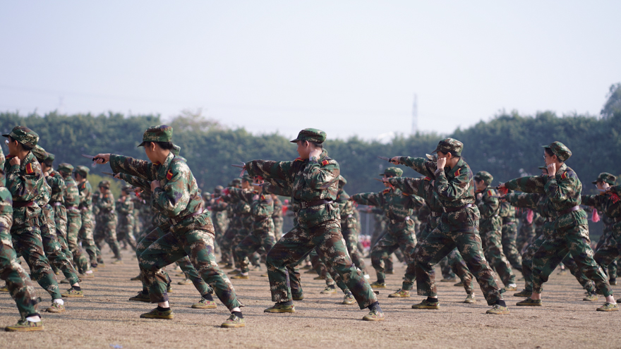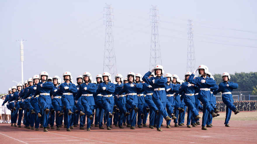 分列式结束,随之而来的是表演方队的精彩表现。男子擒敌拳伴随着豪气十足的音乐开始,或格挡、或出拳,一招一式动作流畅有力,展现出学子们的蓬勃生气与激昂斗志。“中华儿女多奇志,不爱红装爱武装。”由200多位学子组成的女子匕首操方阵极具视觉冲击力。她们手持匕首,或戳刺、或挥舞,挺拔的身姿,统一的步伐,展现出她们的自信与向上的精神,诠释了“巾帼不让须眉”的内涵。