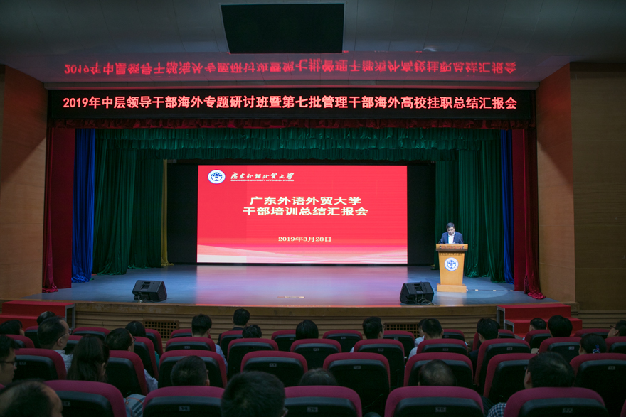 本网讯 3月28日下午,2019年中层领导干部海外专题研讨班暨第七批管理干部海外高校挂职总结汇报会在北校区六教报告厅举行,8位中层干部海外培训班学员代表和3位管理干部海外高校挂职学习项目学员代表分别作了学习调研情况汇报。校党委书记隋广军作总结讲话。校领导,正、副处职(级)干部,管理机构科级负责人,教学教辅单位系(部、室、中心)主任参加会议。会议由副校长焦方太主持。