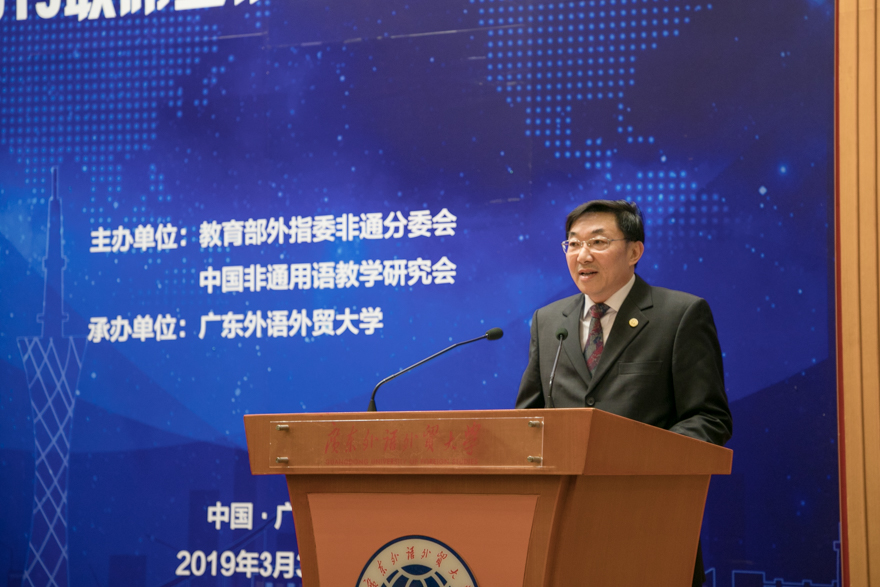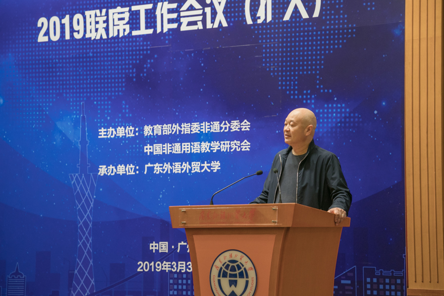 外指委非通分委会主任委员、北京大学教授姜景奎在致辞中向大会说明了选定我校来承办此次会议的意义以及此次会议本身的意义,尤其对我校的非通用语学科发展和非通用语教育表示了充分肯定与赞赏。他强调我校是国内为数不多的设立了专门的非通用语种教学与研究中心。设有国家高等学校外语非通用语种本科人才培养基地,负责对接外指委非通分委会和非通教研会,以及协调落实各项具体工作,体现了我校对于外语非通用语教育的重视。