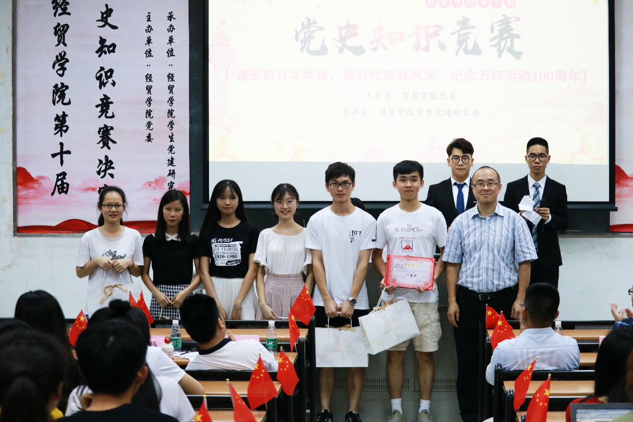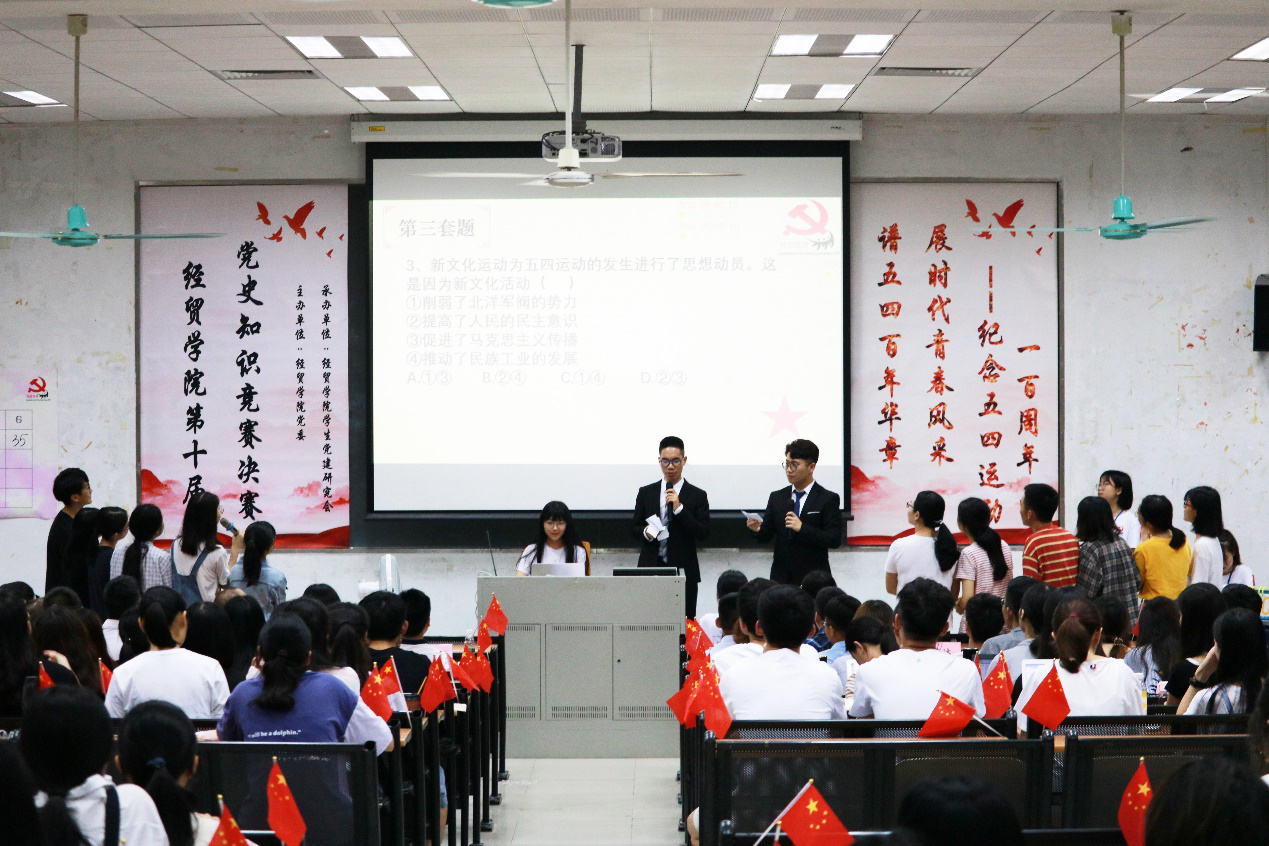 本网讯 4月28日晚,我校经贸学院第十届党史知识竞赛决赛在南校区教学楼E204举行。本次党史知识竞赛以“谱五四百年华章,展时代青春风采”为主题,旨在让学生对五四运动及精神有更深入的了解,提高学生的理论素养,增强学生的爱国情怀。