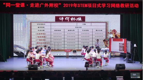 活动中,来自广外外校的老师谭可锋与来自广外附小的老师吴玉梅分别执教《皮影戏里的玄机》、《飞行旗里的高科技》。两位老师以丰富的教学内容、巧妙的教学设计,呈现出了不同教学风格的课堂。谭可锋围绕猜想、验证、推导“皮影戏里的玄机”这条主线,以小组分工合作的方式,整合运用物理、数学、美术、音乐、戏剧等学科知识,引导学生自主探究,让学生通过动手制作皮影戏道具、设计皮影戏剧情。吴玉梅则以STEM项目式学习为方法,让学生利用在创客中学习到的一些输入输出设备自主设计和创作智能飞行棋。