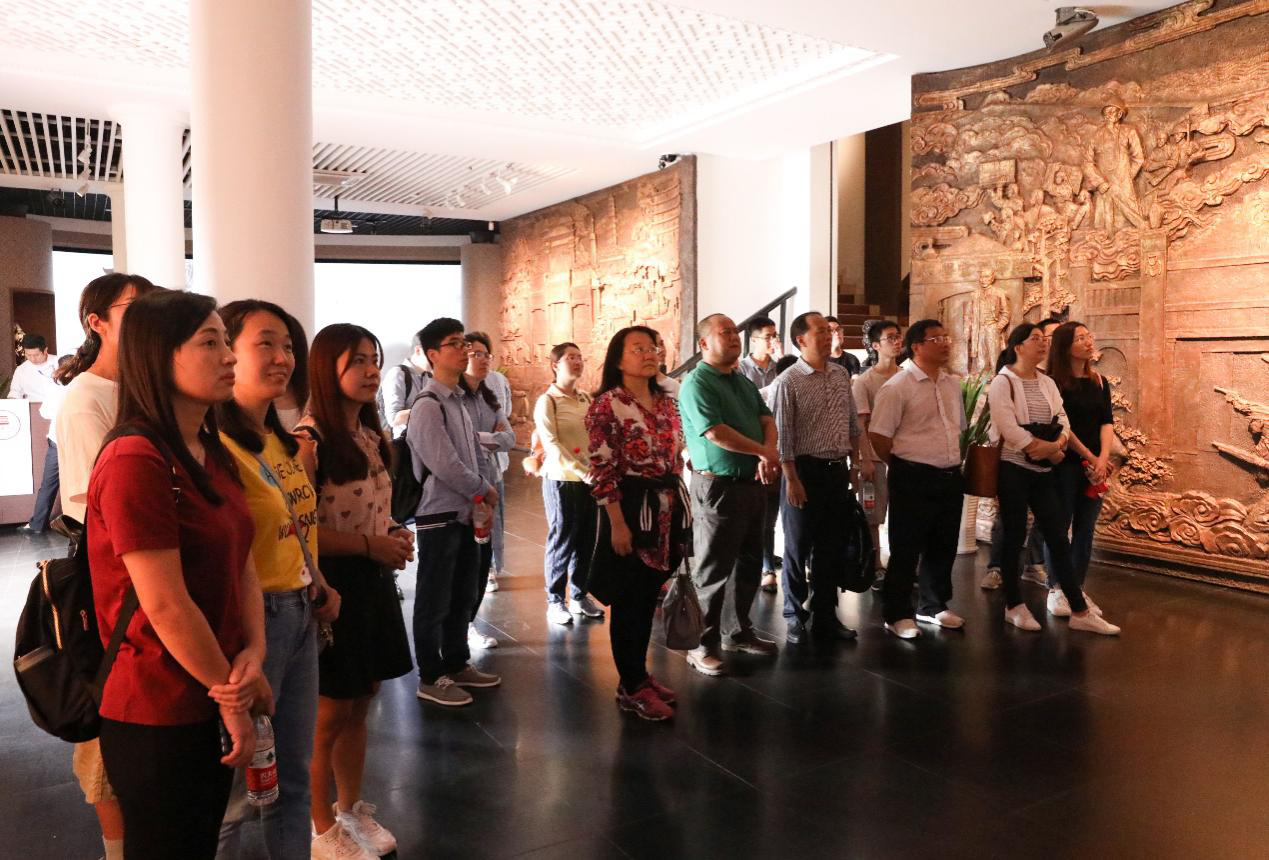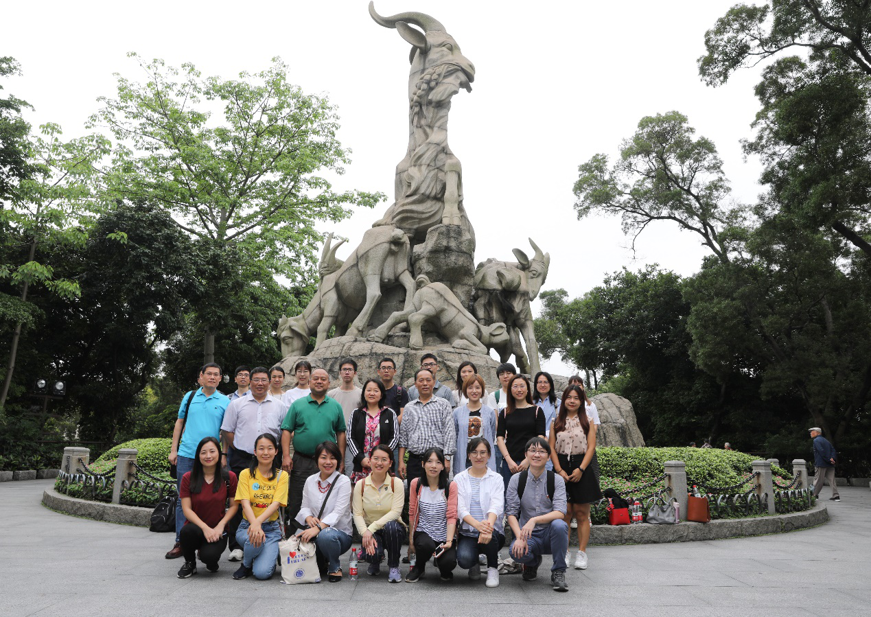 图书馆一行来到越秀公园,参观了五羊雕塑、广州博物馆镇海楼、中山纪念碑。在镇海楼,青年馆员们跟随讲解员,观看了讲述广州城市景观变迁过程的影片《成长的天际线》,体验了广州全域沙盘模型、“一江两岸三带”模型等展览项目,完整浏览了广州2200多年来的城市发展历程。来到镇海楼顶层,驻足欣赏清末将领彭玉麟所撰对联,馆员们感慨万千,对来之不易的和平更加感恩和珍惜。
