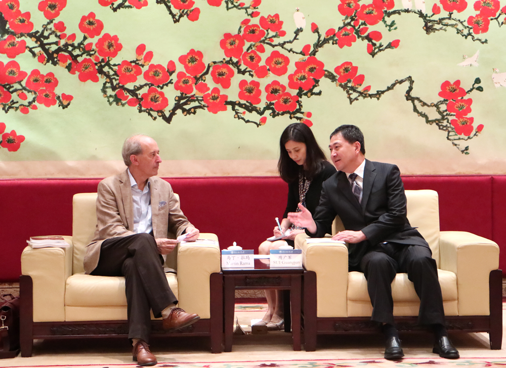 本网讯 5月19日,世界银行南亚地区首席经济学家办公室高级顾问、前首席经济学家马丁·拉玛(Dr.Martin Rama)、世界银行南亚地区首席经济学家办公室高级经济学家李悦(Dr.LI Yue),世界银行南亚地区首席经济学家办公室经济学家罗伯特·卡尔·迈克尔·拜尔(Dr.Robert CarlMichael Beyer)来访我校,参加在我校举办的世界银行系列讲座活动。我校党委书记隋广军在北校区行政楼贵宾厅会见来宾,双方就促进智库建设、加强交流合作等进行探讨。