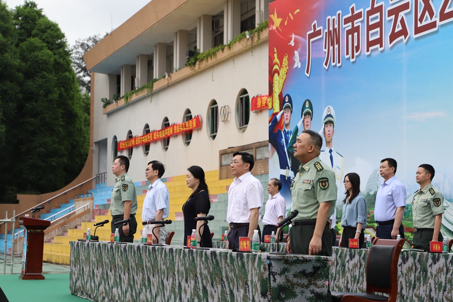 本网讯 5月20日上午,“白云区2019年大学生征兵工作启动仪式”在我校北校区运动场举行,启动仪式上对国家及省市鼓励大学生参军的优惠政策作以介绍,对白云区大学生征兵工作进行全面部署。区委常委、区人武部部长唐晚华,副区长卢绮文,我校党委副书记李云明、副校长何传添等出席了本次活动。参加活动的还有来自白云区20余所高校的1000余名师生代表。