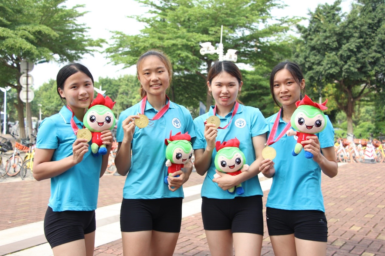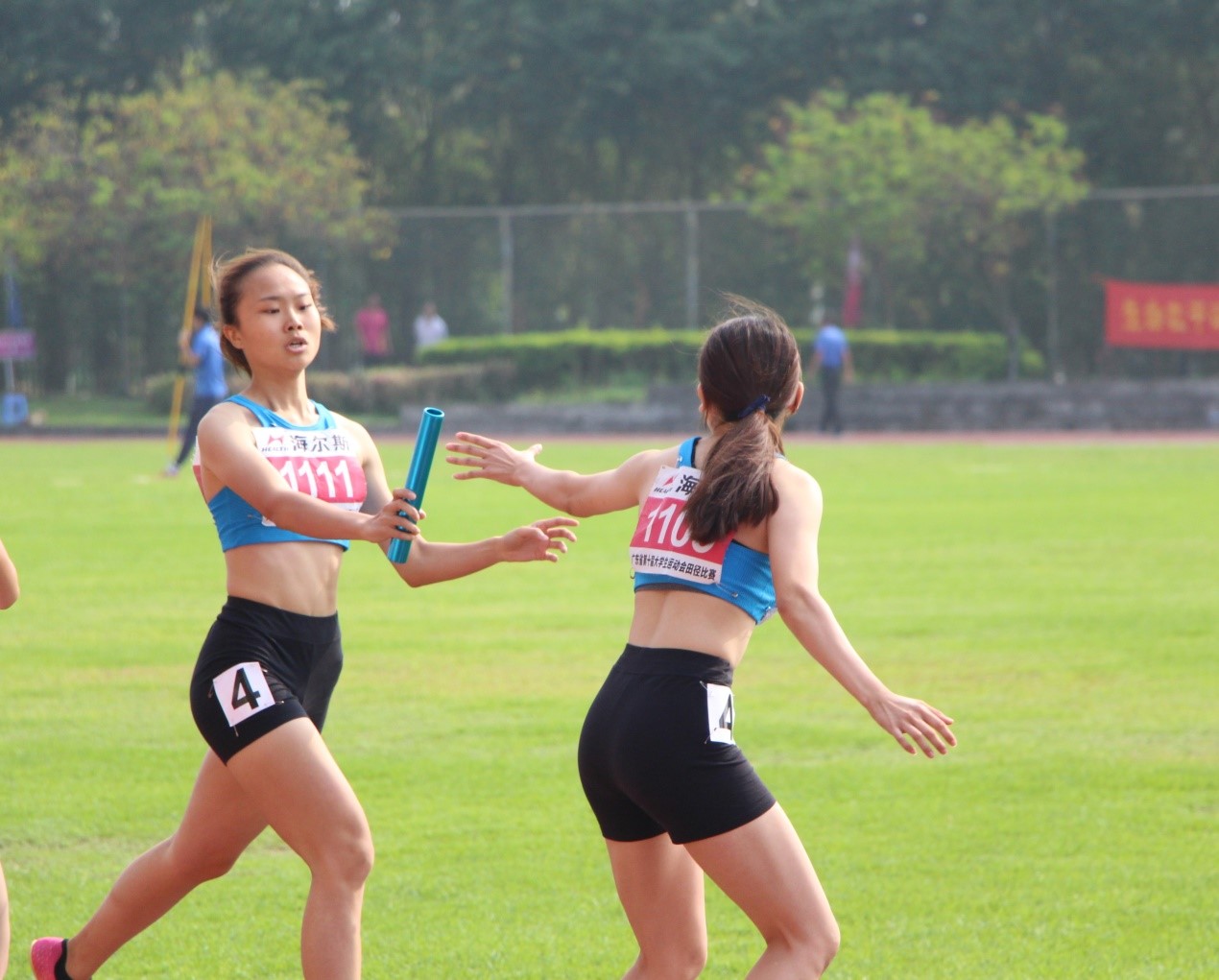 枪声响起,我校女子4×400米第一棒队员陈燕卿率先出发,与第二棒的李欣顺利完成交接,并逐步确定领先地位。第三棒接力的李怡依然保持领先优势,将接力棒传递给陈艳霞,在全场的欢呼声和呐喊声中,最后一棒的陈艳霞冲刺并率先冲线,拿下了这枚金牌。