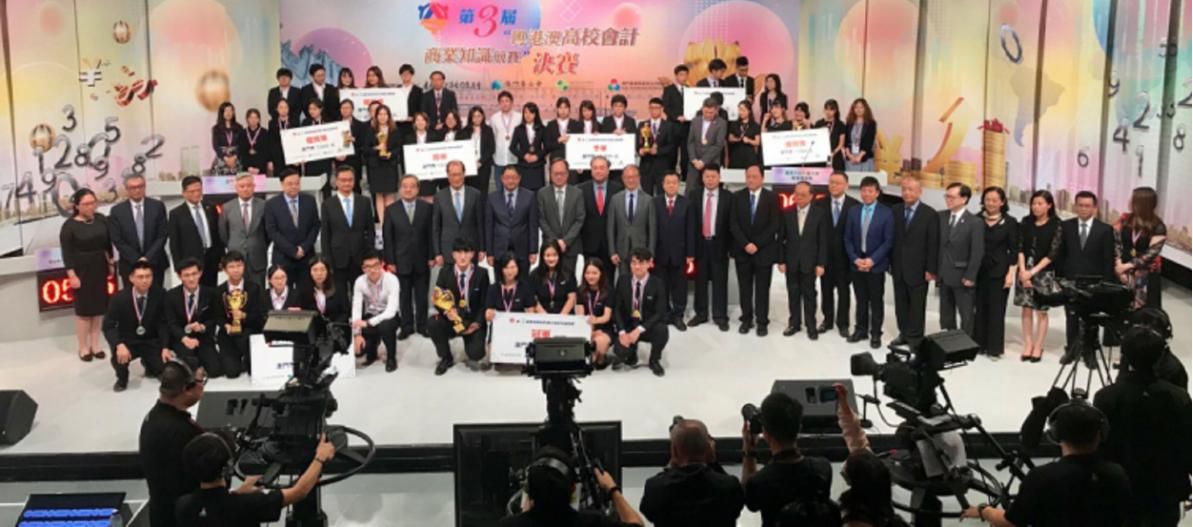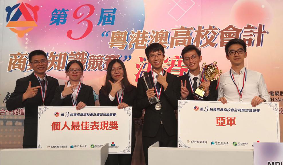 本网讯 5月24日,第三届粤港澳高校会计商业知识竞赛决赛在澳门广播电视台综艺二馆举行,该赛事具有规格高、影响力强,辐射范围广的特点,吸引了来自粤港澳八所院校共八支赛队竞逐奖项。经过大半年的备赛和激烈的决赛,我校参赛队伍“广东外语外贸大学凤鸣岭南队”荣获亚军。会计学院2015级卢浩伦同学凭借出色表现获得唯一的“个人最佳表现奖”。