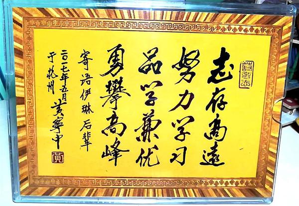 现在,她把那幅寄寓厚望的书法摆在书桌旁,“志存高远,努力学习,品学兼优,勇攀高峰”,十六个朴实简单的大字,却字字都是成功的密匙,生活的真理。在高三冲刺阶段每个奋斗的夜晚,每次伏案学习到深夜,阿黄抬头望望这幅训言,就会提醒自己努力的意义,想起心中不懈追求的梦想。心中珍视的梦想虽然看起来那么遥不可及,但她相信在努力的积累下,最终一定能攀上高峰。在高考结束填写志愿的时候,亲戚们纷纷提议要选一些高分好就业的专业,但阿黄的兴趣不在那里,她想成为一名作家。尽管这个理想看起来有点难以实现,不太符合长辈们的期待,但阿黄想起叔父给她的训言,“志存高远”,难道不是在提醒我应该坚持自己的志向吗?思考至此,阿黄毅然决然地选择了中文专业,朝自己的梦想努力奋斗着。