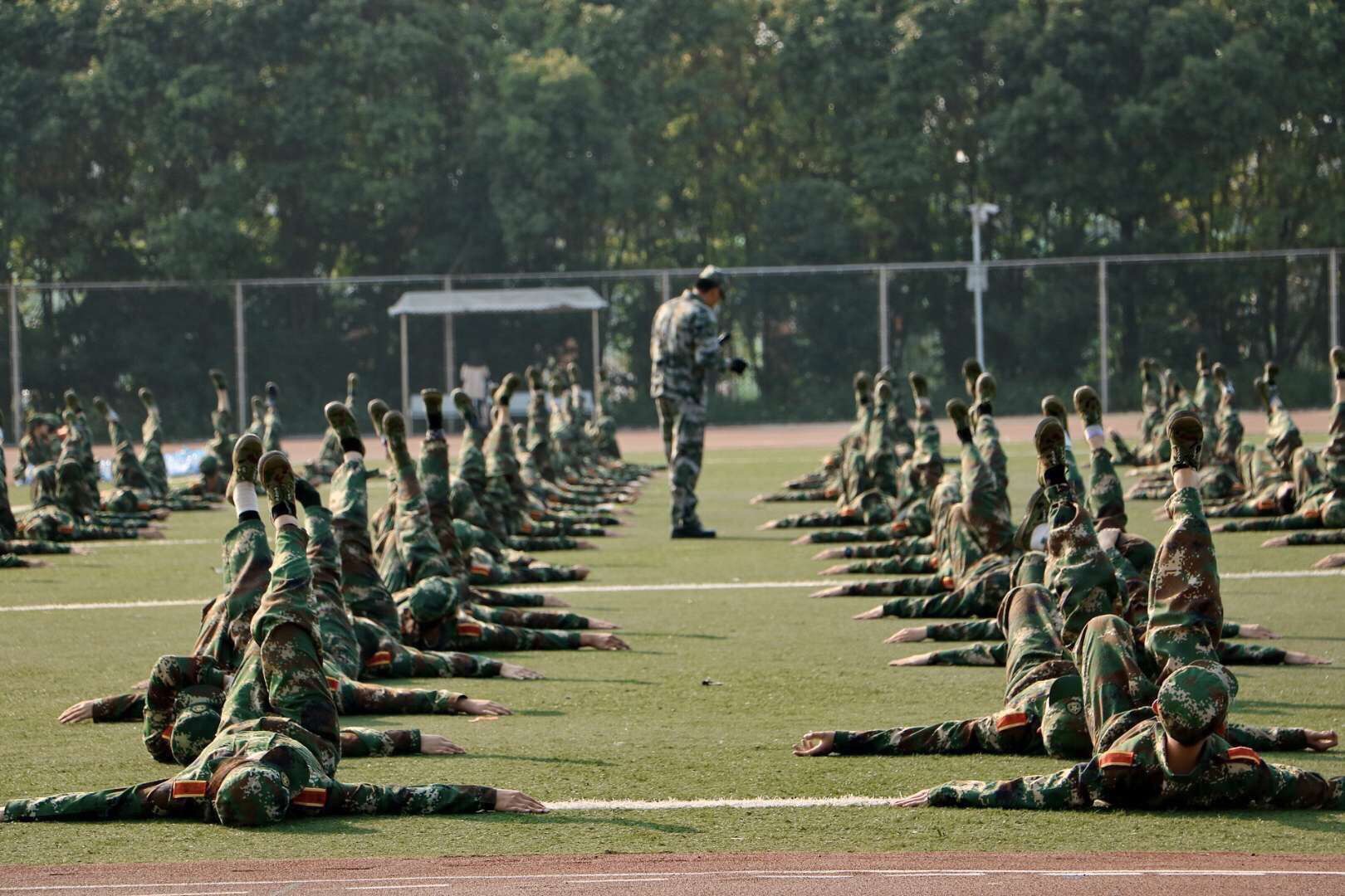 站军姿、踢正步、顶水瓶、倒功、随时随地的坐姿或蹲姿要求......这些日复一日的训练日常,让大多数同学的衣服都有了脏旧痕迹。这期间,同学们不仅要用它抵御骄阳或寒风,而且在草坪和跑道上穿着军服直接蹲坐也几乎是军训“标配”。