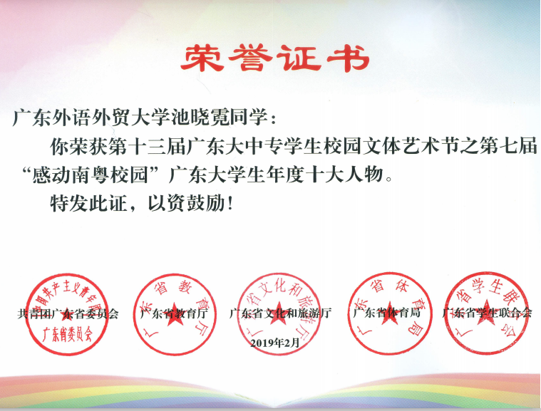 本网讯 由共青团广东省委员会、广东省教育厅、广东省文化厅、广东省体育局以及广东省学生联合会联合举办的第十三届广东大中专学生校园文体艺术节之第七届“感动南粤校园”广东大学生年度十大人物评选活动结果揭晓,经过资格审查、网络投票、专家评审层层选拔,我校商学院市场营销专业2015级学生池晓霓同学在全省参评学生中脱颖而出,获评第十三届“感动南粤校园”年度十大人物称号。