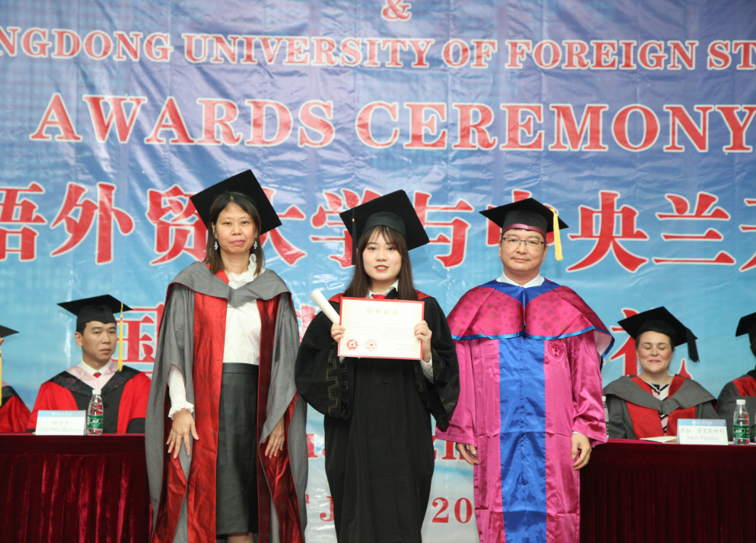 三位奖学金获得者作为学生代表,依次上台与同学们分享了他们的学习经历和在广外的成长体会,代表所有结业生向学校领导、老师和家人、朋友表达了诚挚的感谢,并表达了对未来的展望和目标。兰开夏创新创业副教授、中国区培训项目负责人陈泽敏作为校友代表,预祝同学们在兰开夏不懈奋斗,取得更好的成绩。兰开夏项目课程主管Jacob Hill为典礼致闭幕辞,对学生这两年在学习上的辛勤投入表示赞扬,并对学生们顺利完成在广外的学业表示衷心祝贺。