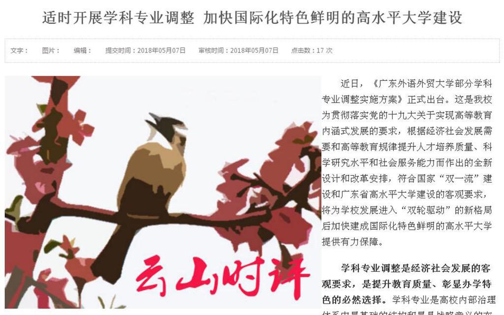 七年来,学校结合国家和广东高等教育发展趋势,适时开展学科专业调整,优化学科专业布局结构,拓宽相关学科专业发展空间。2014年,主动适应经济社会发展需要,优化以学科交叉融合为导向的资源配置模式,增强学科建设的系统性、整体性和协同性,构建有利于协同创新的学科发展体制机制,按照“有序性”“相近性”“特色性”“差异性”“发展性”原则,成立经管学部和文学学部,并对相关学院专业进行调整。2018年,在国家学科建设政策从以二级学科为主转到一级学科为主的背景下,作为全省自主办学综合改革的试点高校,按照“明方向、冲一流、强内涵、树特色”的总要求,对部分学科专业再次进行调整,推进学科专业布局持续得到优化。