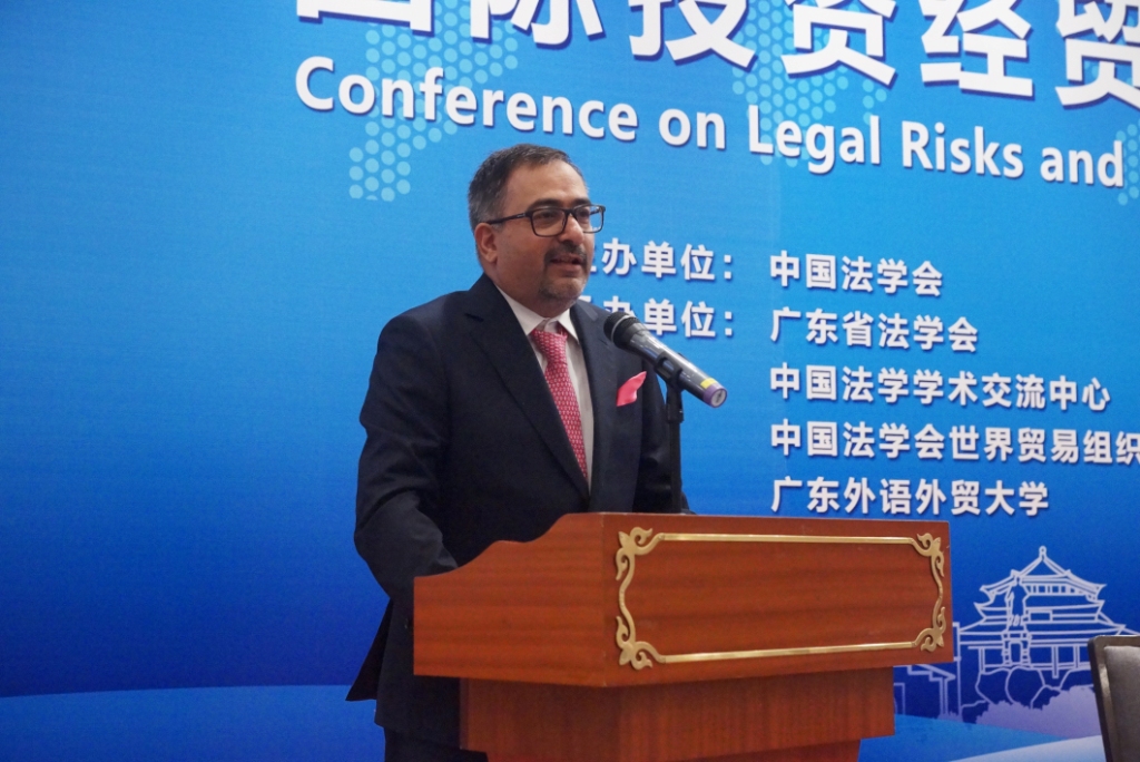 本网讯 6月20日,第六届“国际投资经贸法律风险与对策研讨会”在北校区举行。此次会议由中国法学会主办,广东省法学会、中国法学学术交流中心、中国法学会世界贸易组织法研究会和我校共同承办。本次研讨会以 “深化‘一带一路’法治合作,共建开放型世界经济”为主题,来自五大洲36个国家和地区的200多位法学法律界和工商界代表出席了会议。中国法学会副会长兼秘书长张鸣起、印度律师协会候任会长普利桑特•库马、中国法学会世界贸易组织法研究会会长林中梁、广东省法学会常务副会长陈文敏、外交部条约法律司参赞田立晓、司法部国际合作局副局长尹雪梅等出席开幕式。开幕式由我校副校长王廷惠主持。