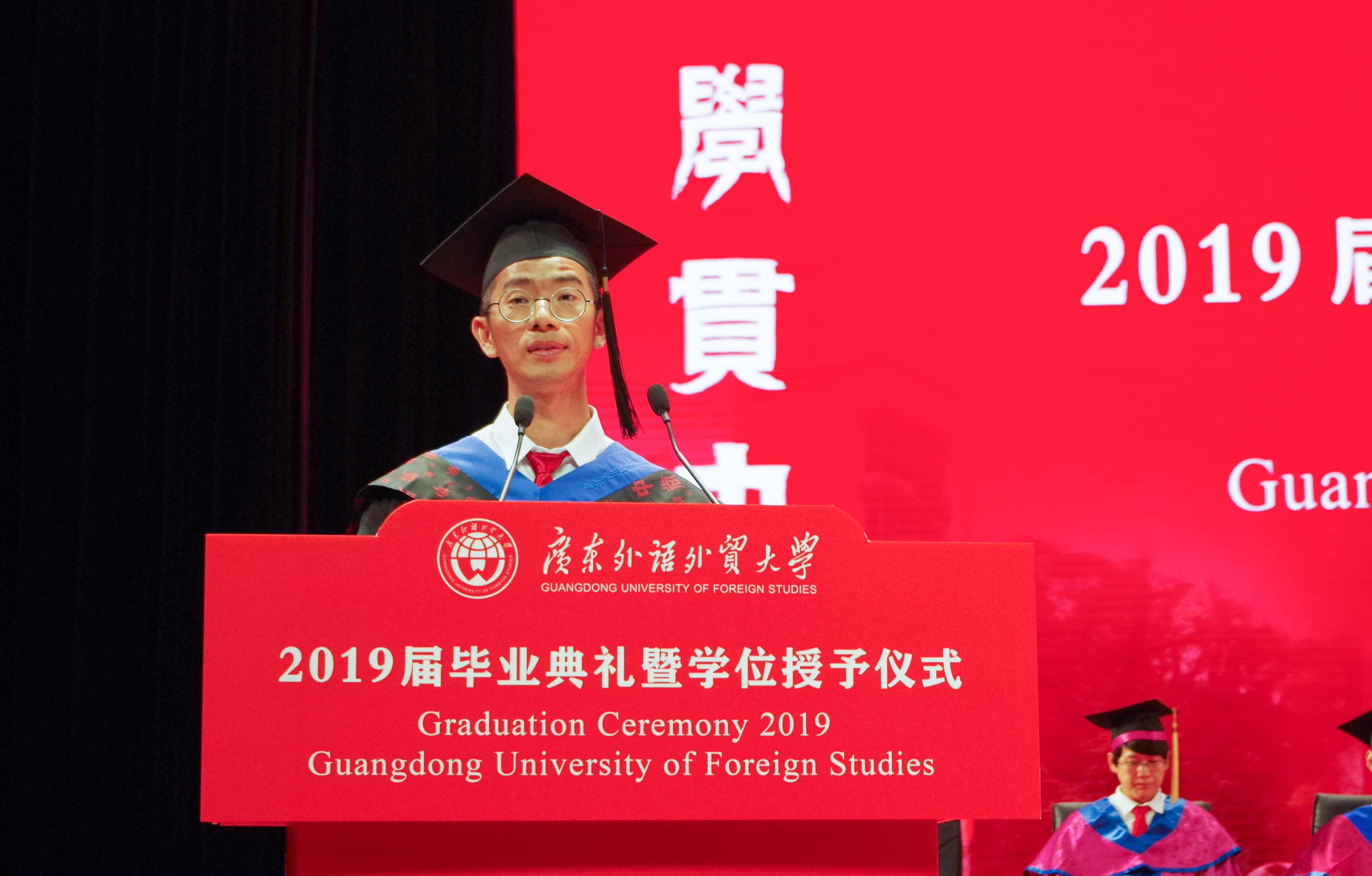 看到你们,我仿佛又回到了“恰同学少年”时。在今天这个隆重的毕业典礼上,作为师兄,我非常乐意与各位分享我的点滴人生感悟,希望对大家有帮助:一是选择你的选择,然后坚持不懈,选择适合自己的平台或机会,通过努力去实现自己的人生目标和价值。二是要保持开放、乐观的心态去拥抱时代,你阳光,世界就不会黑暗。幸福是奋斗出来的。三是你的世界是你创造出来的。我们能传承到广外特有的精气神,掌握学习的能力和做人的道理。