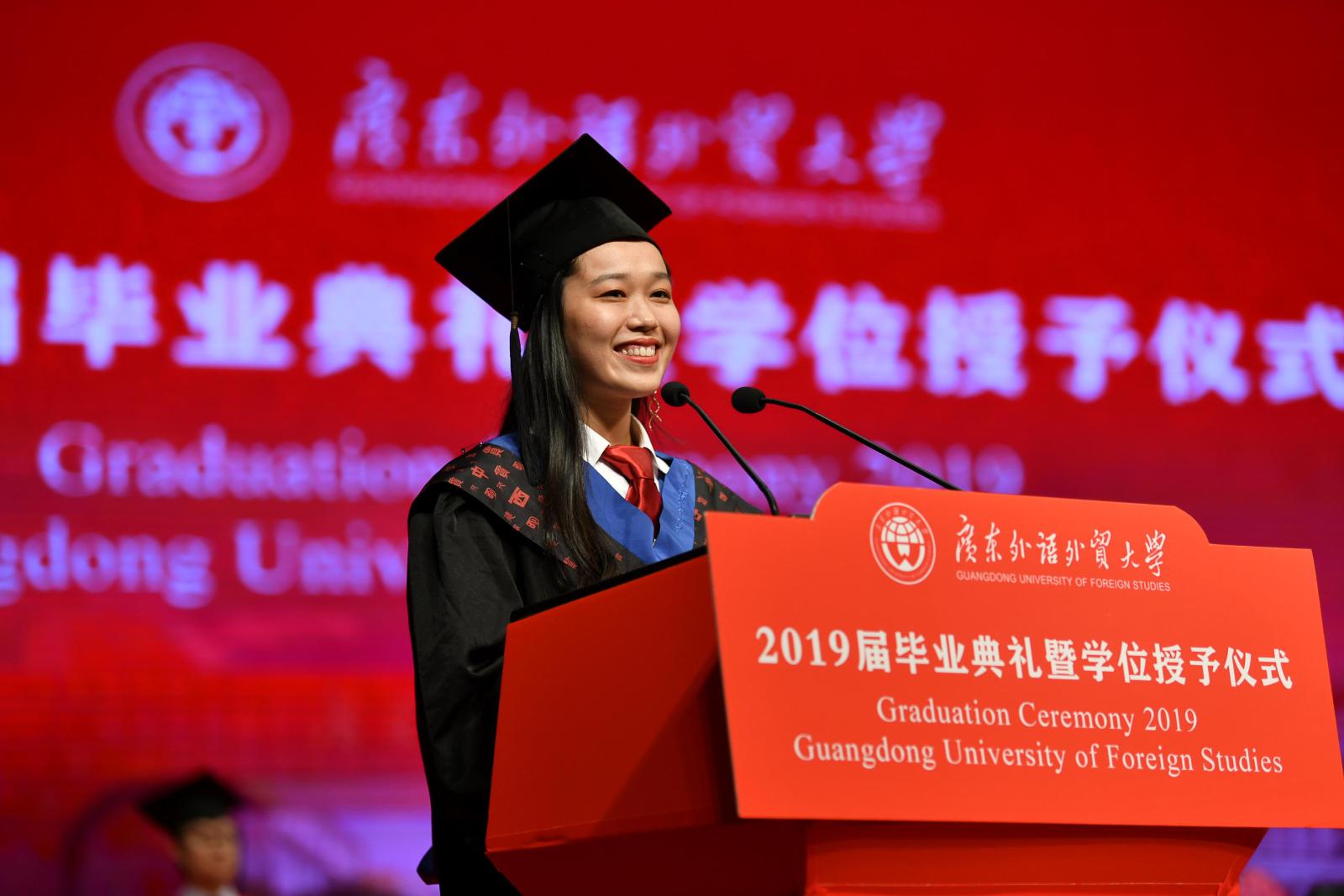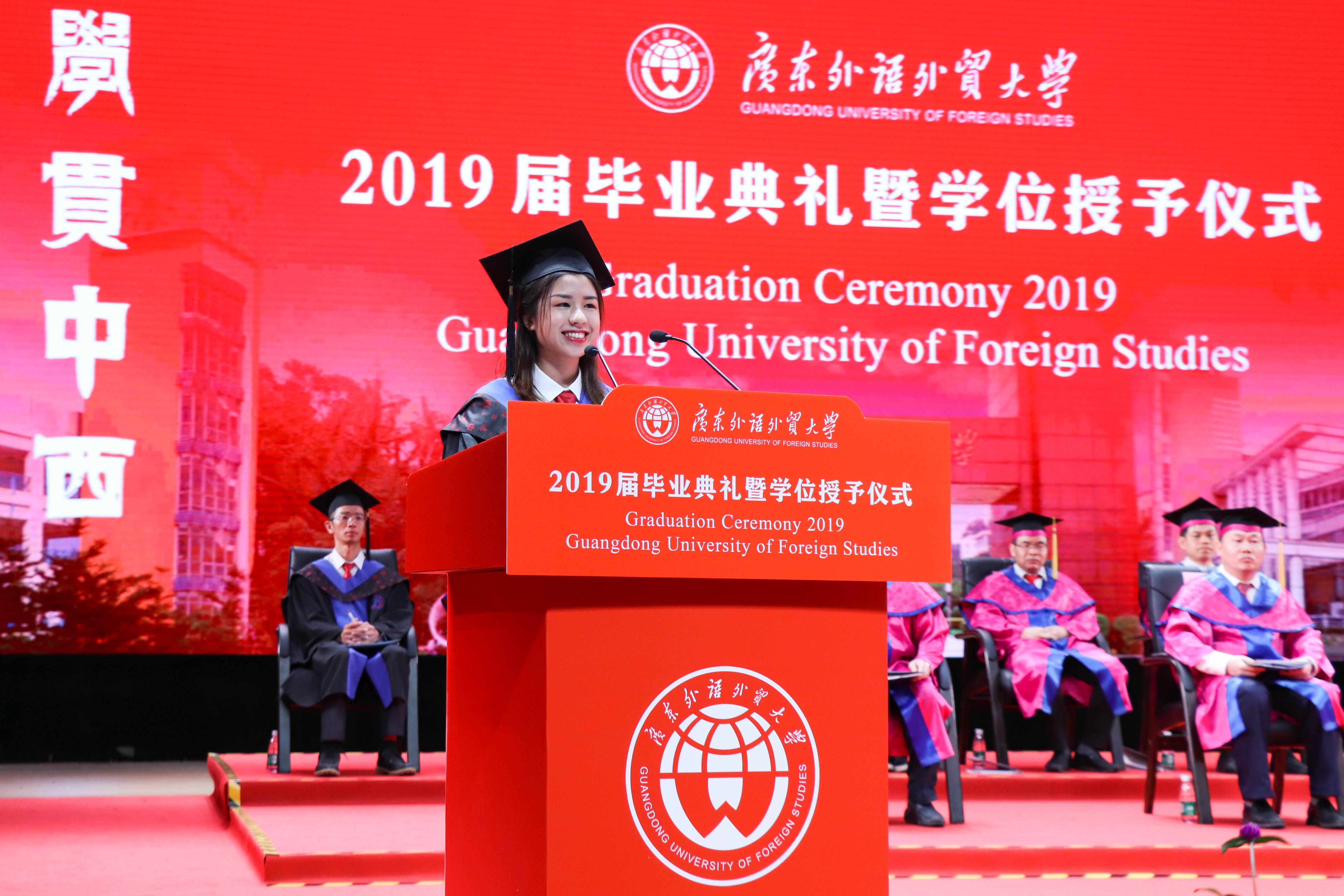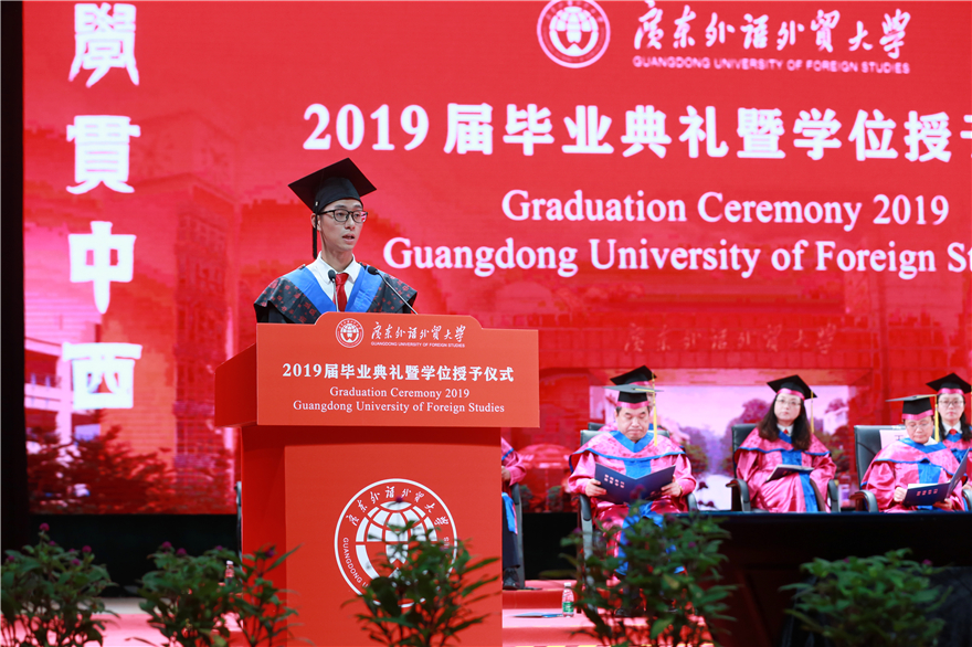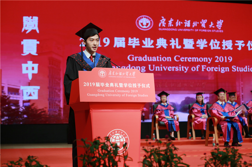 编者按:凤凰花开,骊歌唱响,又是一年毕业季。所有的欢笑和泪水,所有的失败和成功,都在这一刻凝结成收获的果实,这是属于青春的闪光印记。临别之际,千言万语,想要赠予母校,致谢师长,献给同窗。广外新闻网特别推出“毕业生心声”报道,按照典礼场次顺序,与大家分享毕业生代表在2019届毕业典礼上致辞。